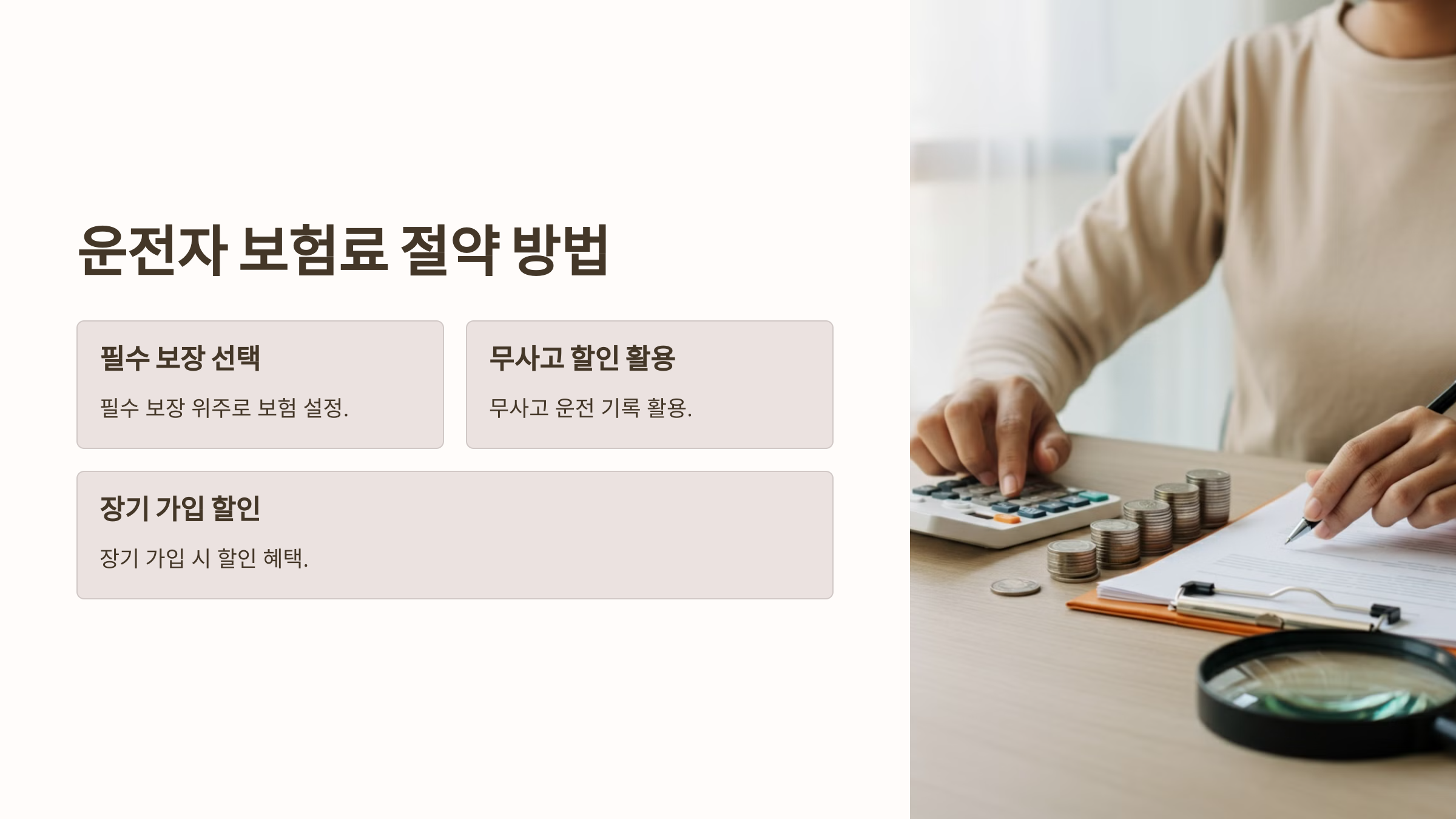- 필수 보장만 선택하여 절약: 필수 보장 항목 위주로 보험을 설정하면 불필요한 항목을 제거하고 보험료를 절감할 수 있습니다. 사고 발생 시 필요한 핵심 보장 항목만 선택해 본인에게 맞는 보험료를 설정해 보세요.