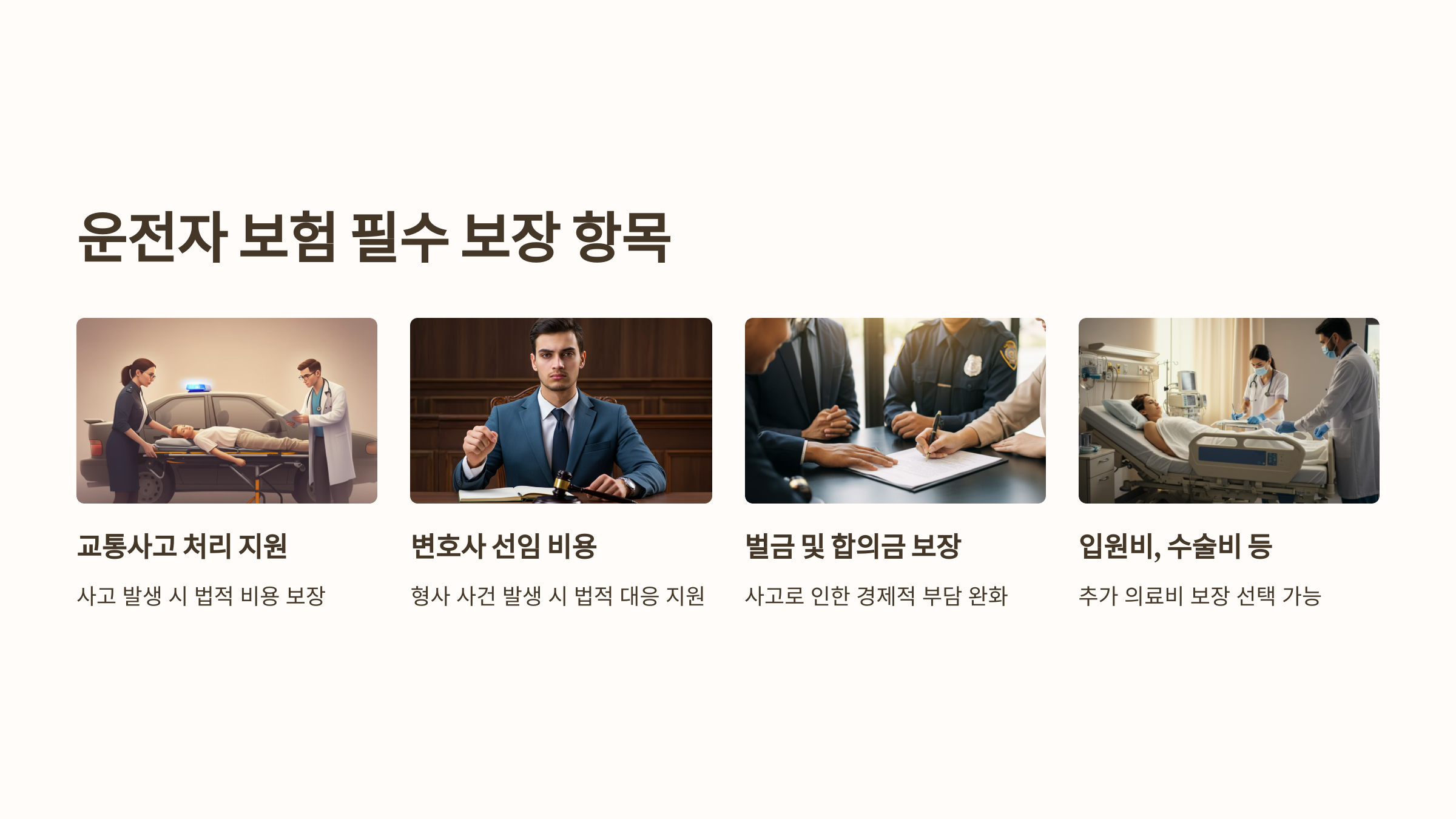 FAQ 1: 운전자 보험에서 필수로 선택해야 하는 보장 항목은 무엇인가요? 운전자 보험의 필수 보장 항목에는 교통사고 처리 지원(형사 합의금, 벌금 보장), 변호사 선임 비용, 교통사고 벌금 등이 포함됩니다. 이들은 사고 발생 시 법적 및 재정적 지원을 제공하여 운전자의 부담을 줄여 줍니다.
