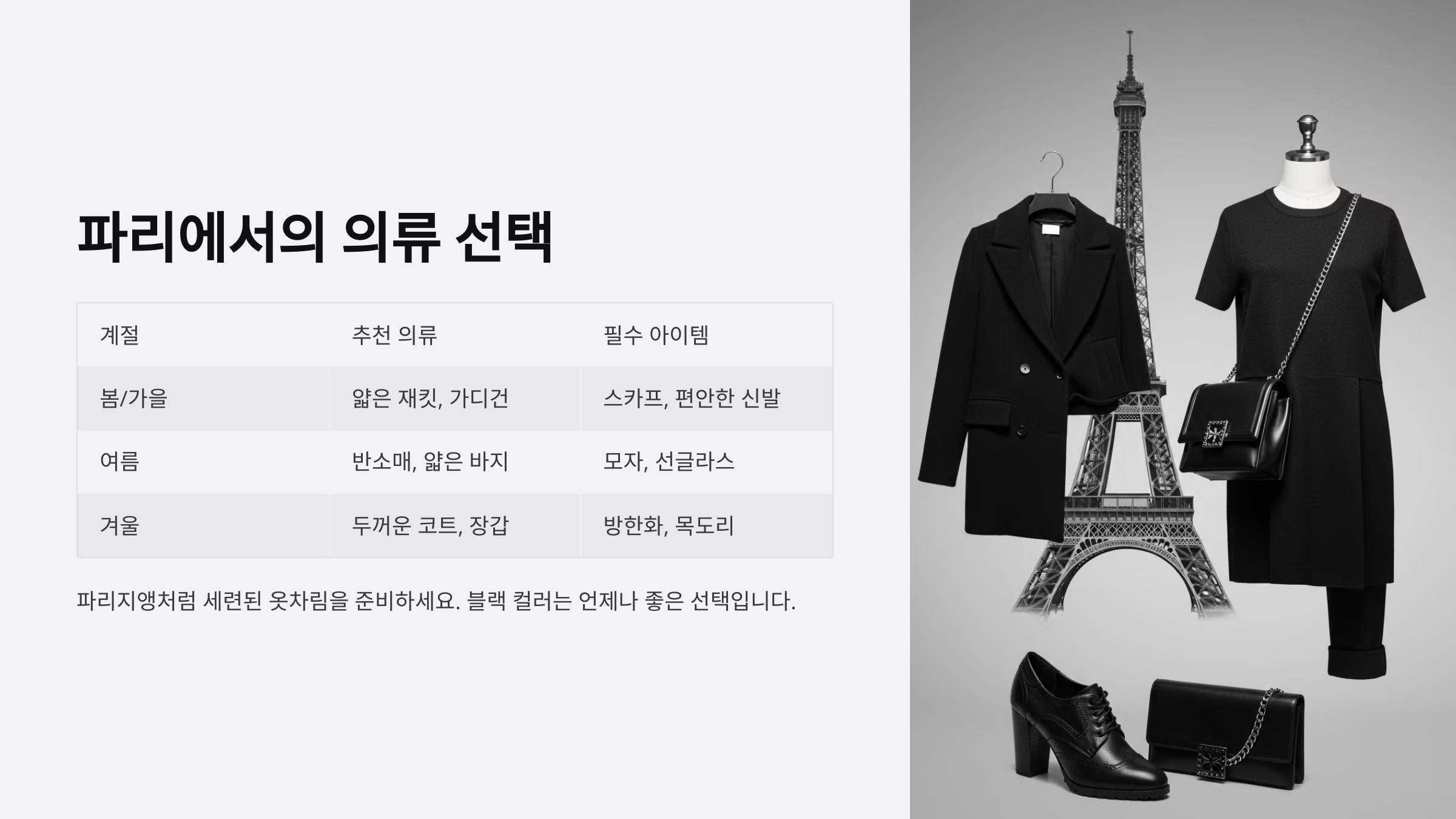 파리는 사계절이 뚜렷하고, 특히 겨울은 꽤 추울 수 있어요. 내가 생각했을 때 파리 여행에서 가장 중요한 의류 준비는 계절에 맞게 옷을 챙기는 거예요. 여름에는 시원한 옷과 가벼운 재킷, 겨울에는 따뜻한 코트와 목도리가 필요해요.