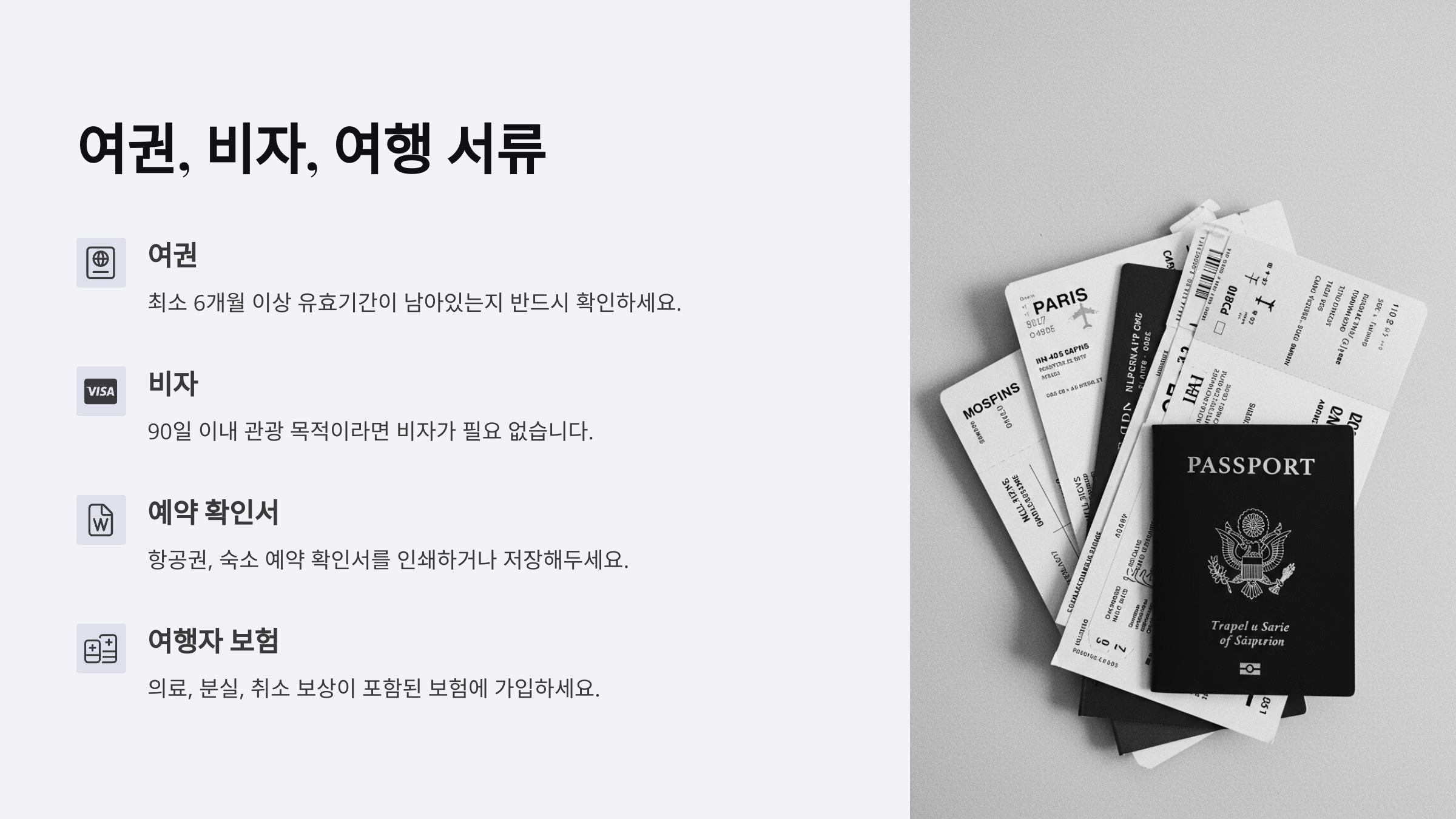 | 여권 | 필수 | 유효기간 확인 필요 |