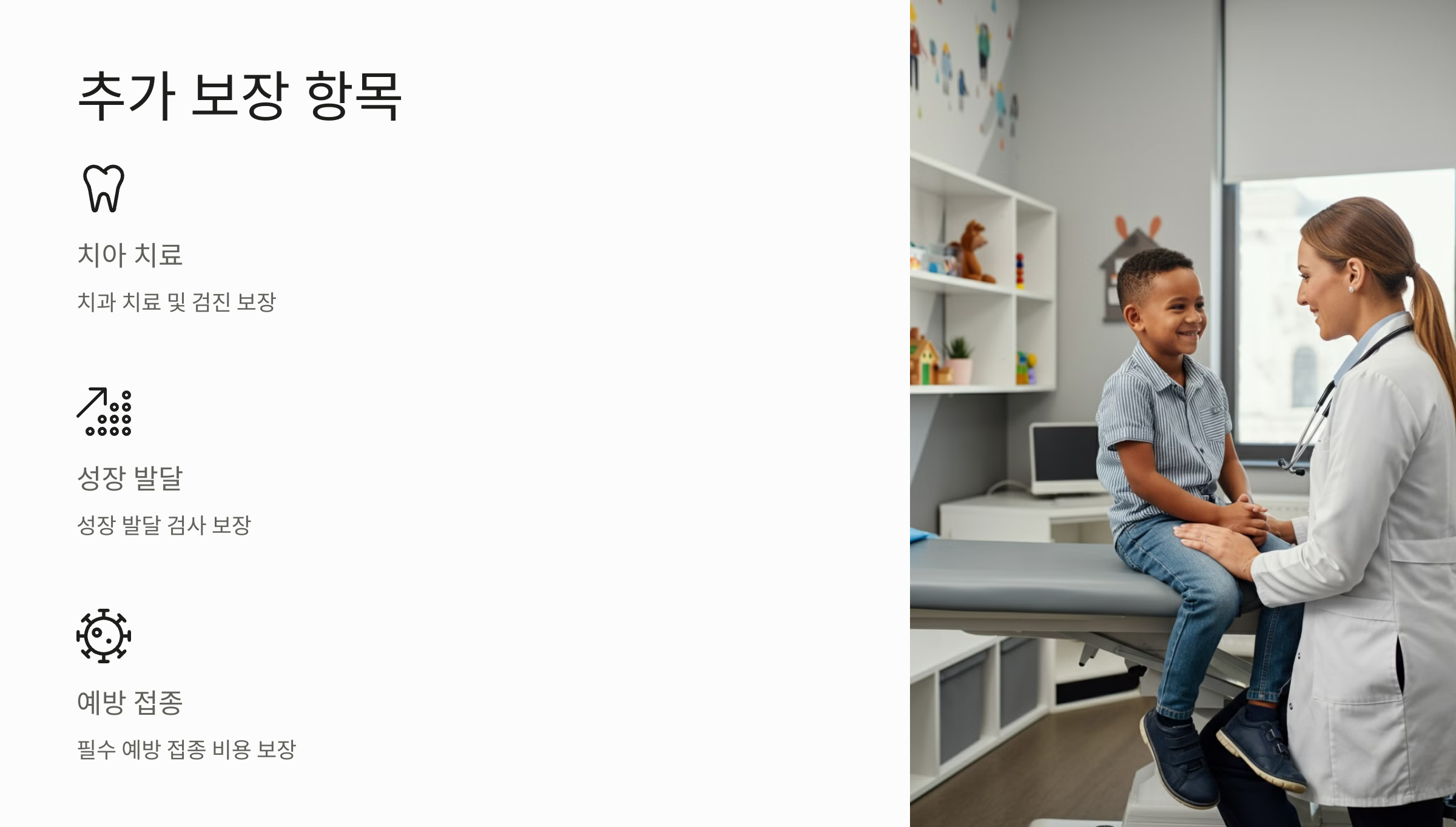 일반적인 보장 외에도 치아 치료나 성장 발달 검사 같은 추가 보장이 필요할 수 있습니다.