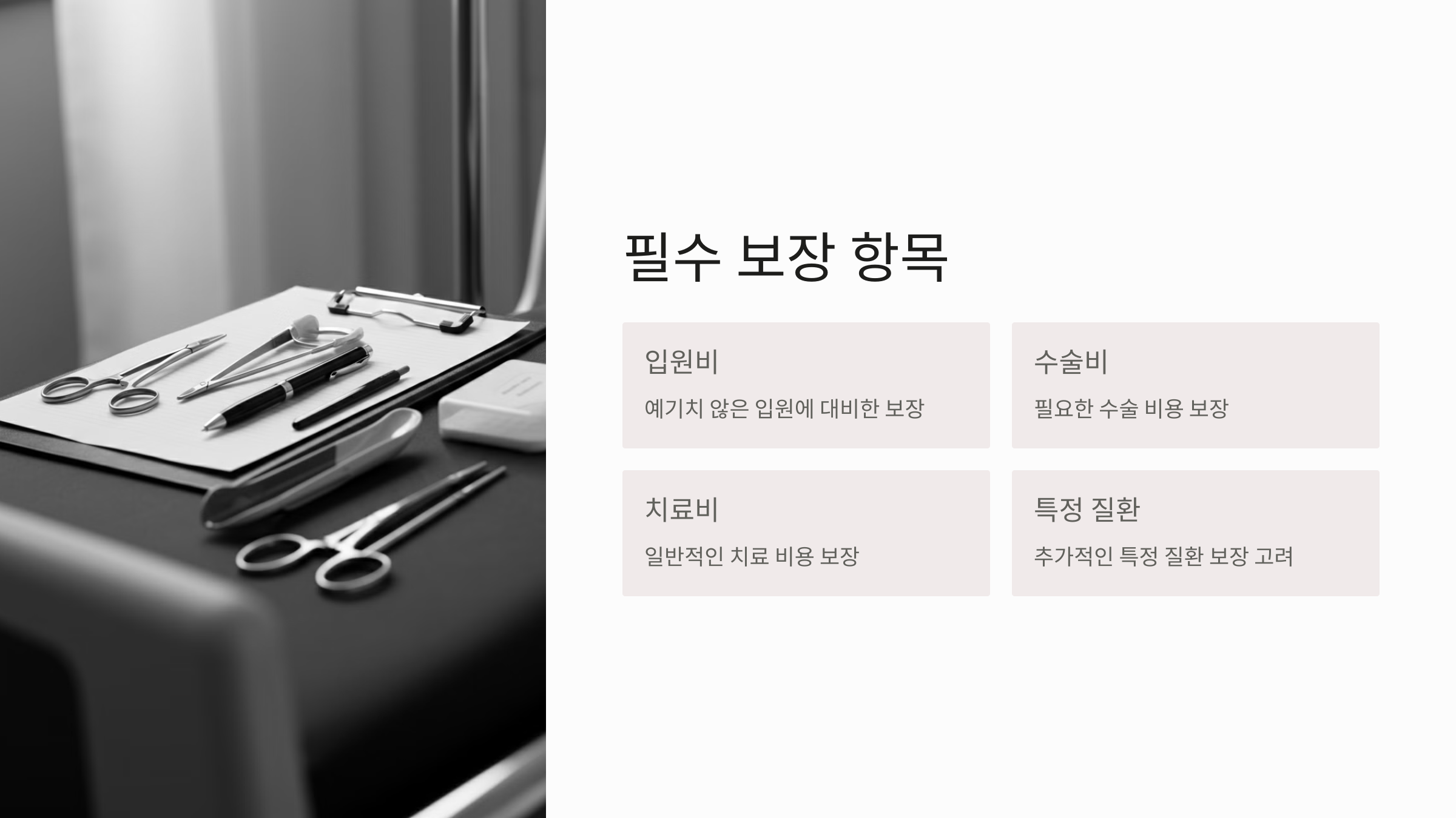예기치 않은 사고나 질병으로 입원이나 수술이 필요한 경우를 대비할 수 있도록 반드시 해당 항목이 포함된 상품을 선택하는 것이 좋습니다. 일부 보험 상품은 특정 질환에 대해 추가적인 보장을 제공하기도 하므로, 자녀에게 필요한 보장이 충분한지 점검하세요.