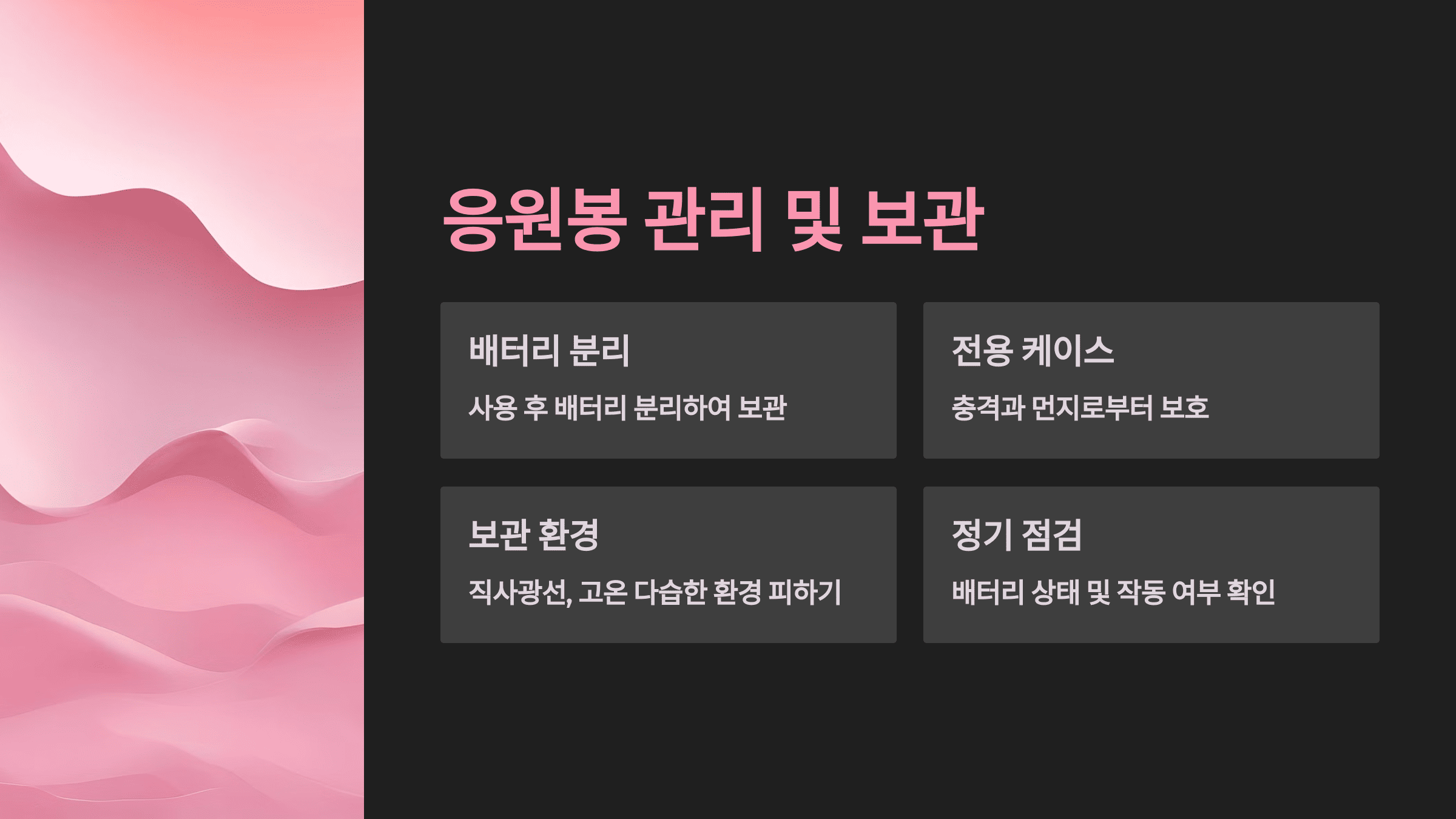 응원봉을 오래 사용하려면 적절한 관리가 중요합니다. 사용 후에는 배터리를 분리해 보관하고, 충격이나 먼지로부터 보호하기 위해 전용 케이스를 사용하는 것이 좋습니다.