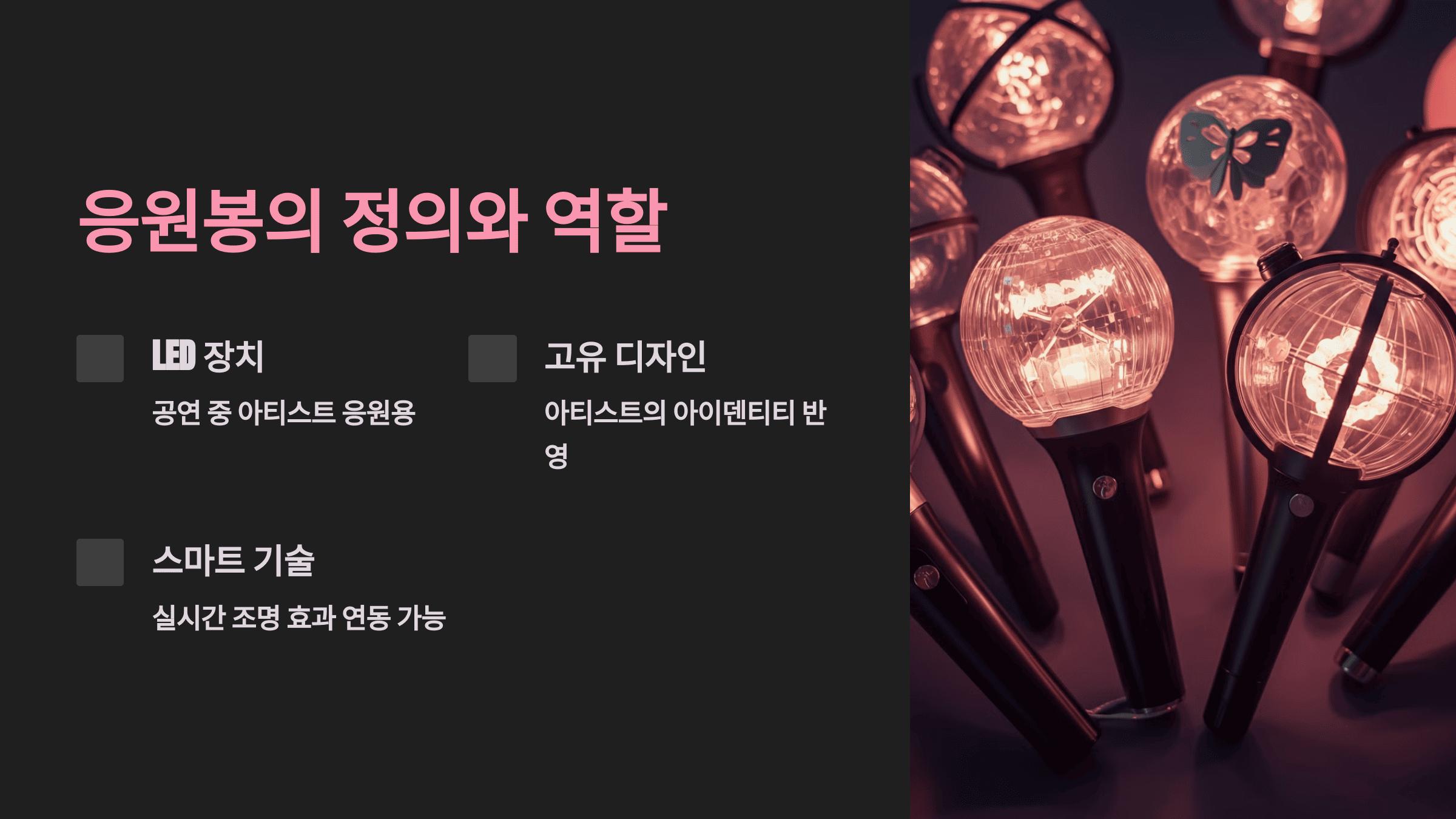 각 아티스트의 아이덴티티를 반영하여 고유한 디자인과 색상을 가진 응원봉은, 팬덤의 상징으로 자리 잡았습니다. 최근에는 스마트 기술이 접목된 응원봉도 많아져, 공연 중 실시간으로 조명 효과를 연동할 수 있습니다.