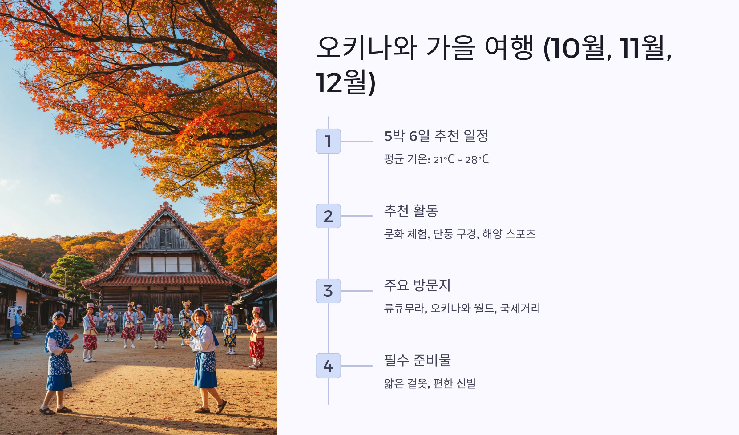 오키나와 가을 여행은 편안하게 자연을 즐기고, 전통 문화를 체험하기에 좋은 시기입니다.