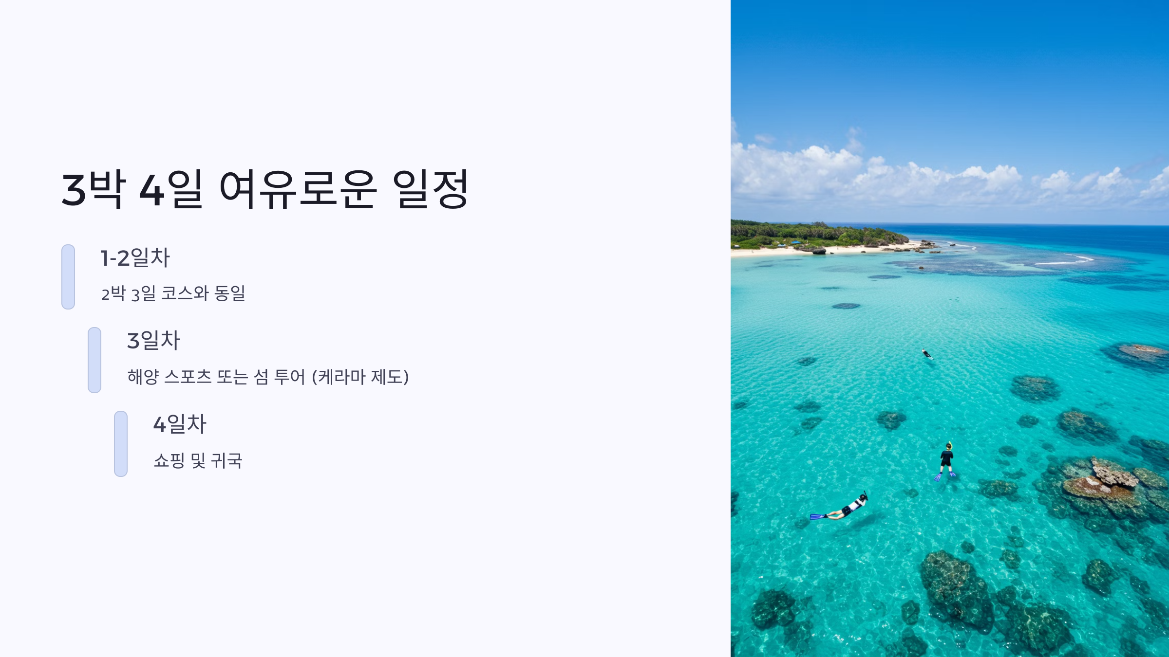 짧게는 2박 3일로도 오키나와의 매력을 충분히 느낄 수 있으며, 여유롭게 즐기고 싶다면 5박 6일 일정도 추천합니다.