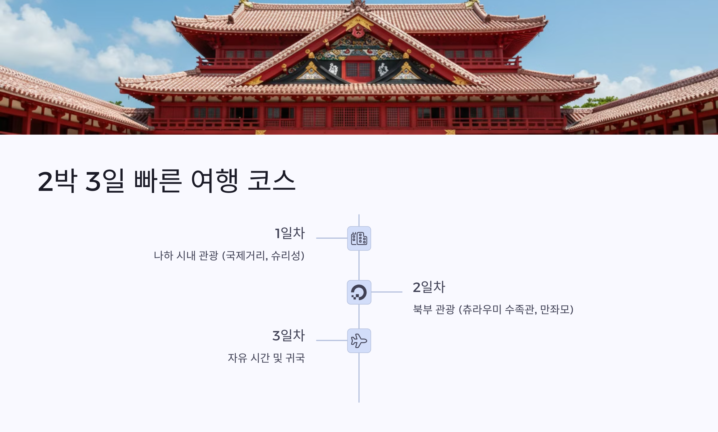 오키나와 2박 3일 일정은 짧은 기간 동안 주요 명소를 빠르게 둘러보는 효율적인 코스입니다.