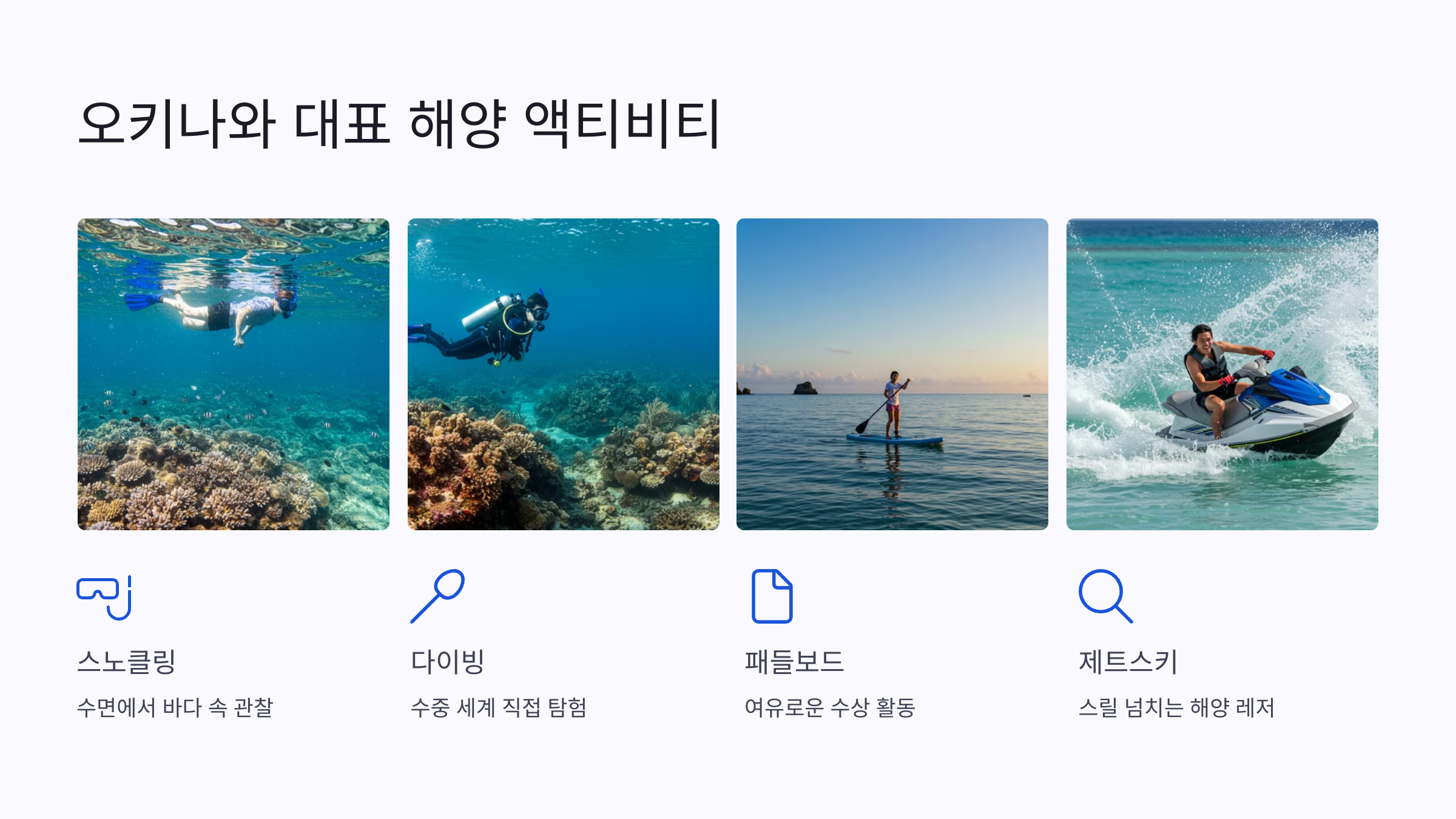 오키나와의 대표적인 해양 액티비티는 스노클링, 다이빙, 패들보드, 제트스키 등입니다.
