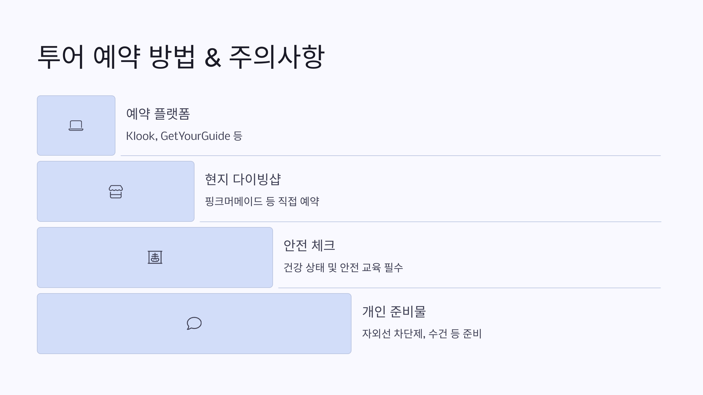 특히 케라마 제도나 블루 케이브 같은 인기 명소는 빠르게 예약이 마감될 수 있으므로 최소 여행 1~2주 전에 예약을 완료하는 것이 좋습니다.