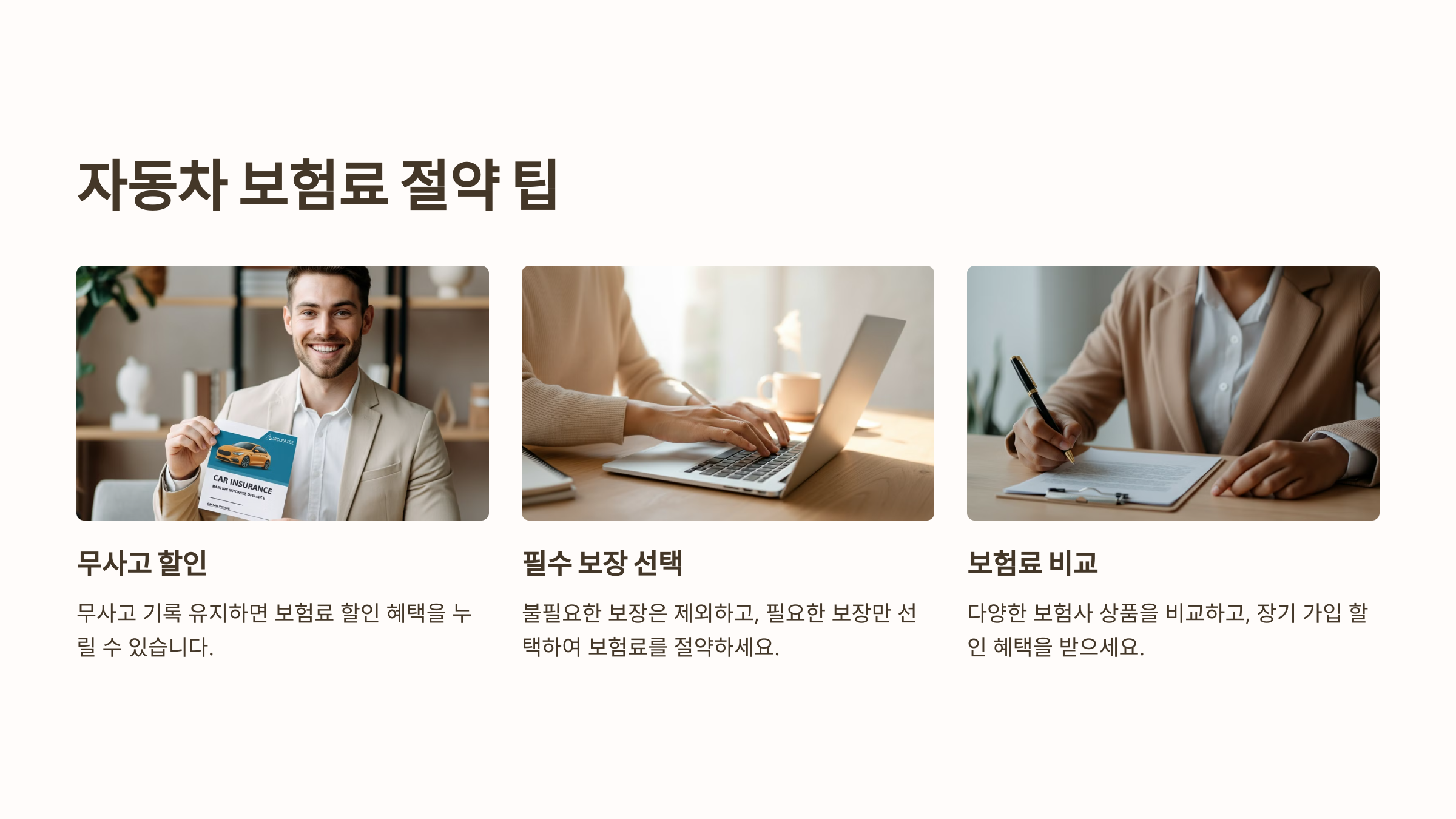 안전 운전 습관을 유지하거나 불필요한 보장 항목을 줄이는 등 보험료 절약에 도움이 되는 여러 가지 팁이 있습니다. 아래에서 보험료를 절감할 수 있는 방법들을 확인해 보세요.