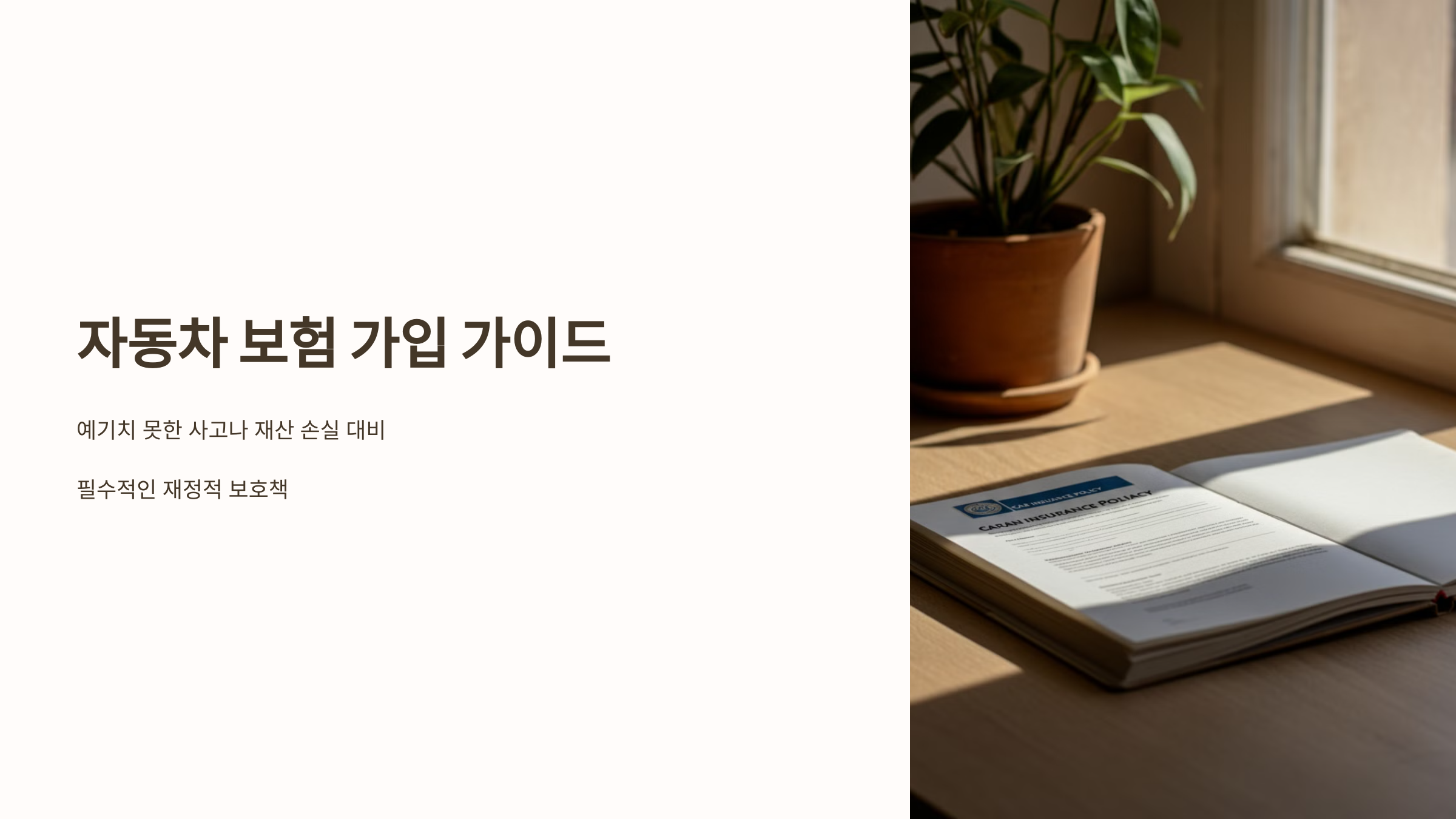 본 가이드는 자동차 보험의 주요 보장 항목과 가입 절차, 보험료 절감 방법을 자세히 설명하며, 운전자에게 맞는 최적의 보험을 선택할 수 있도록 돕기 위해 구성되었습니다.