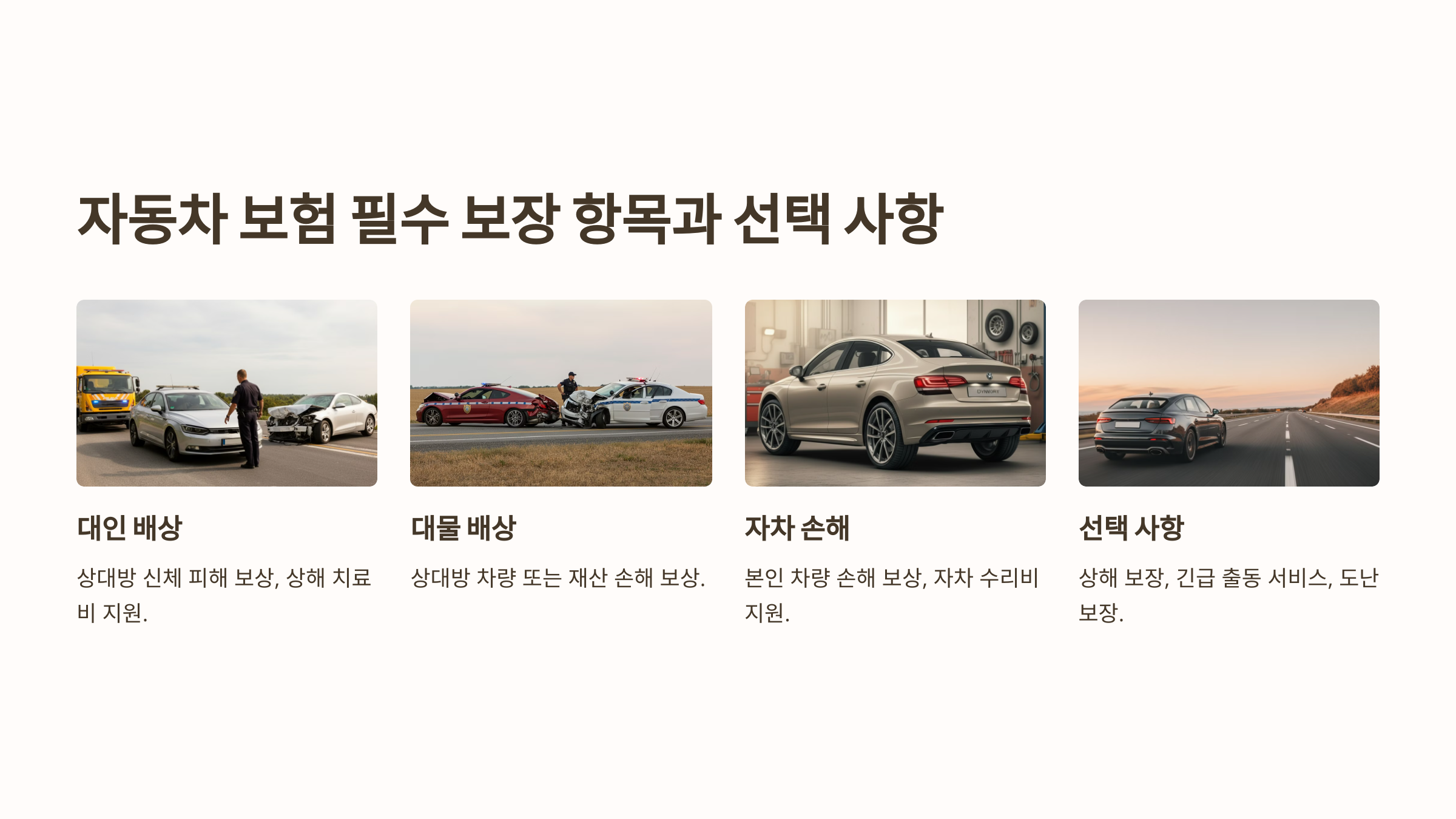 선택 사항은 개인의 운전 빈도나 스타일에 따라 유동적으로 추가할 수 있으며, 아래에서 주요 보장 항목에 대해 자세히 살펴보겠습니다.