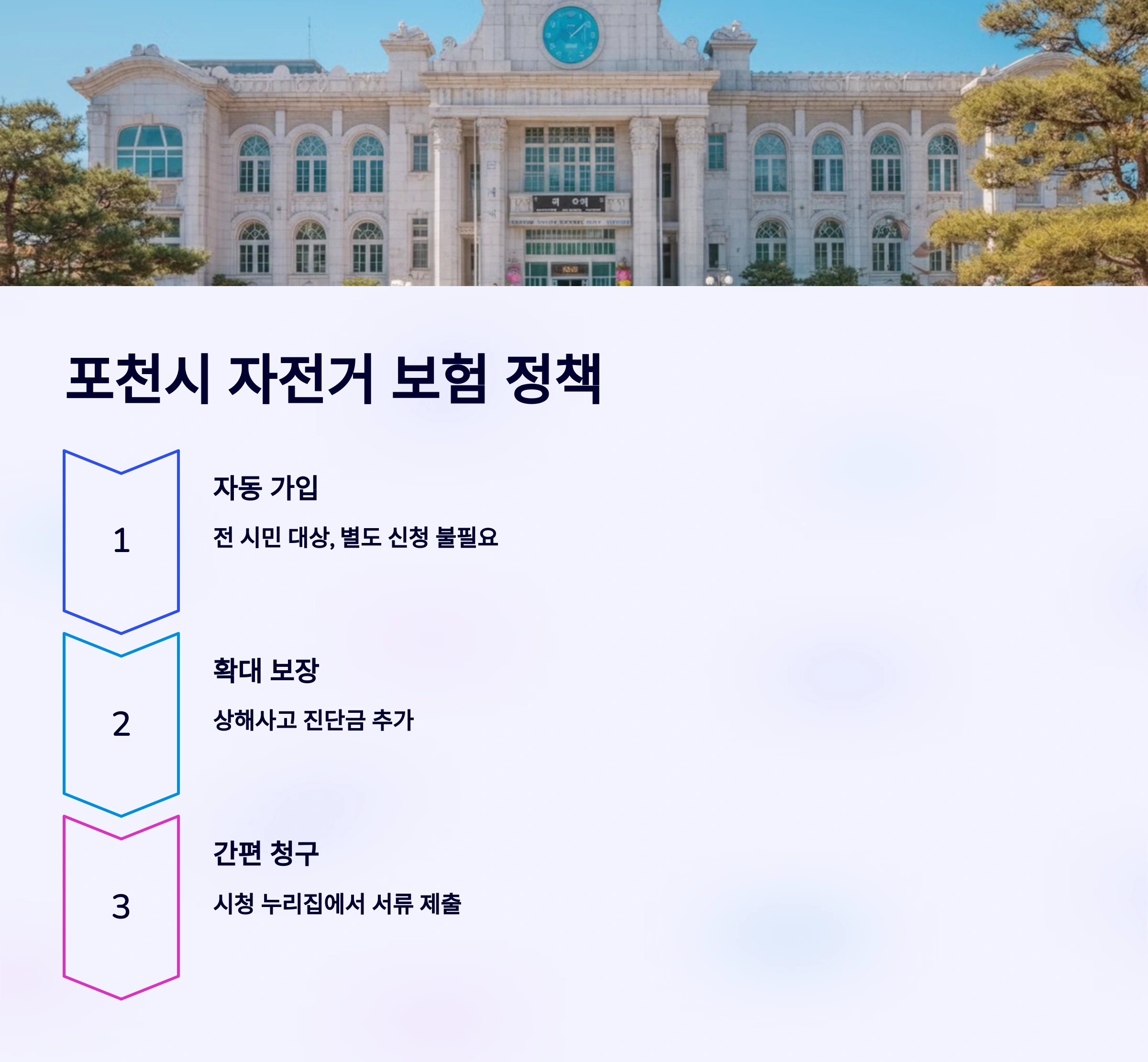 별도의 신청 절차 없이, 주민등록만 되어 있다면 보험 혜택을 받을 수 있어요. 이로 인해 포천시민들은 더욱 안심하고 자전거를 탈 수 있는 환경을 누리고 있답니다.