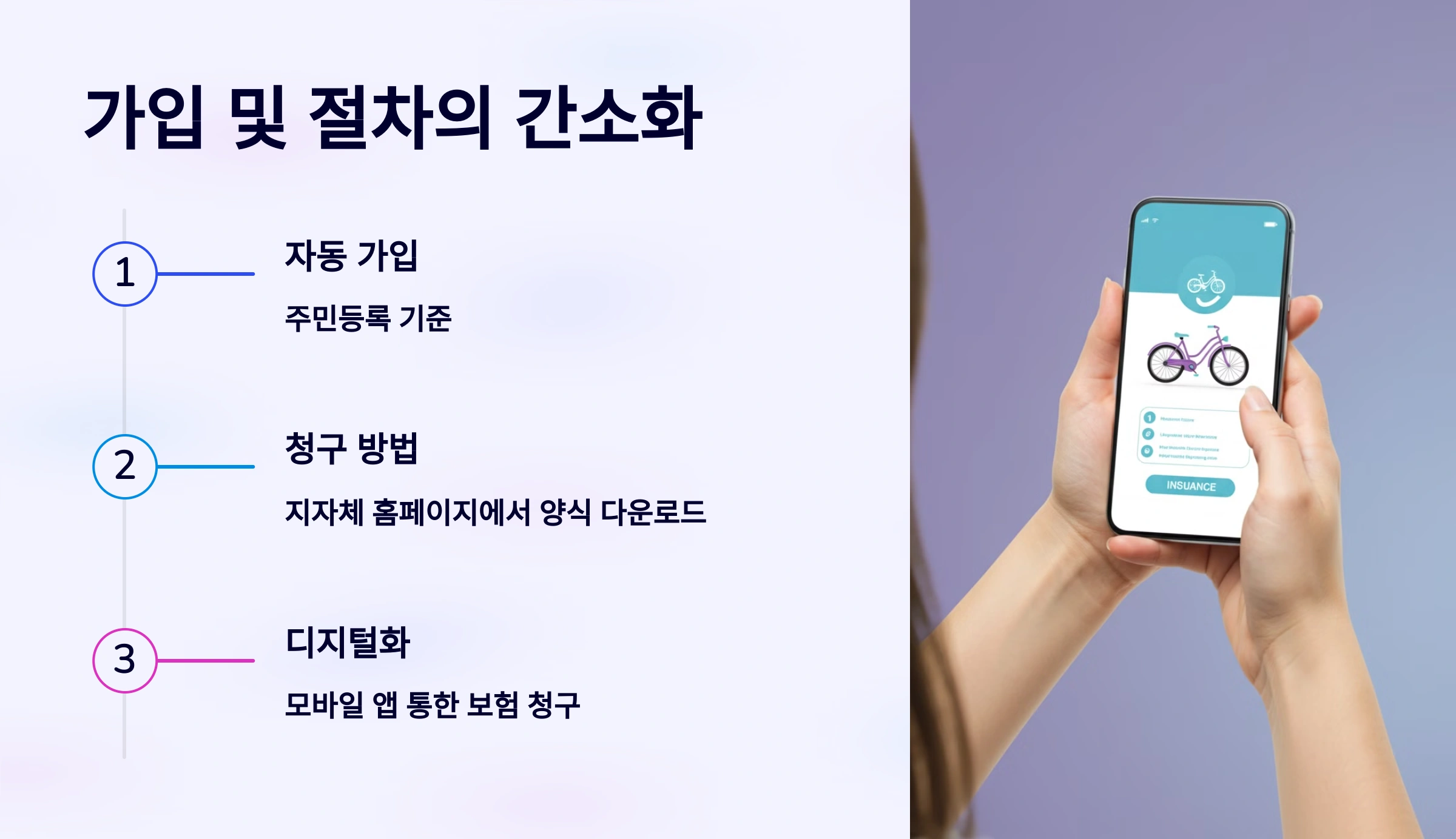 사고 발생 시 별도 신청 없이 자동으로 보상을 받을 수 있는 구조라 주민들의 만족도가 높아요. 또, 자전거와 전동 이동장치(PM) 사고도 포함해 보장의 폭을 넓혔답니다.