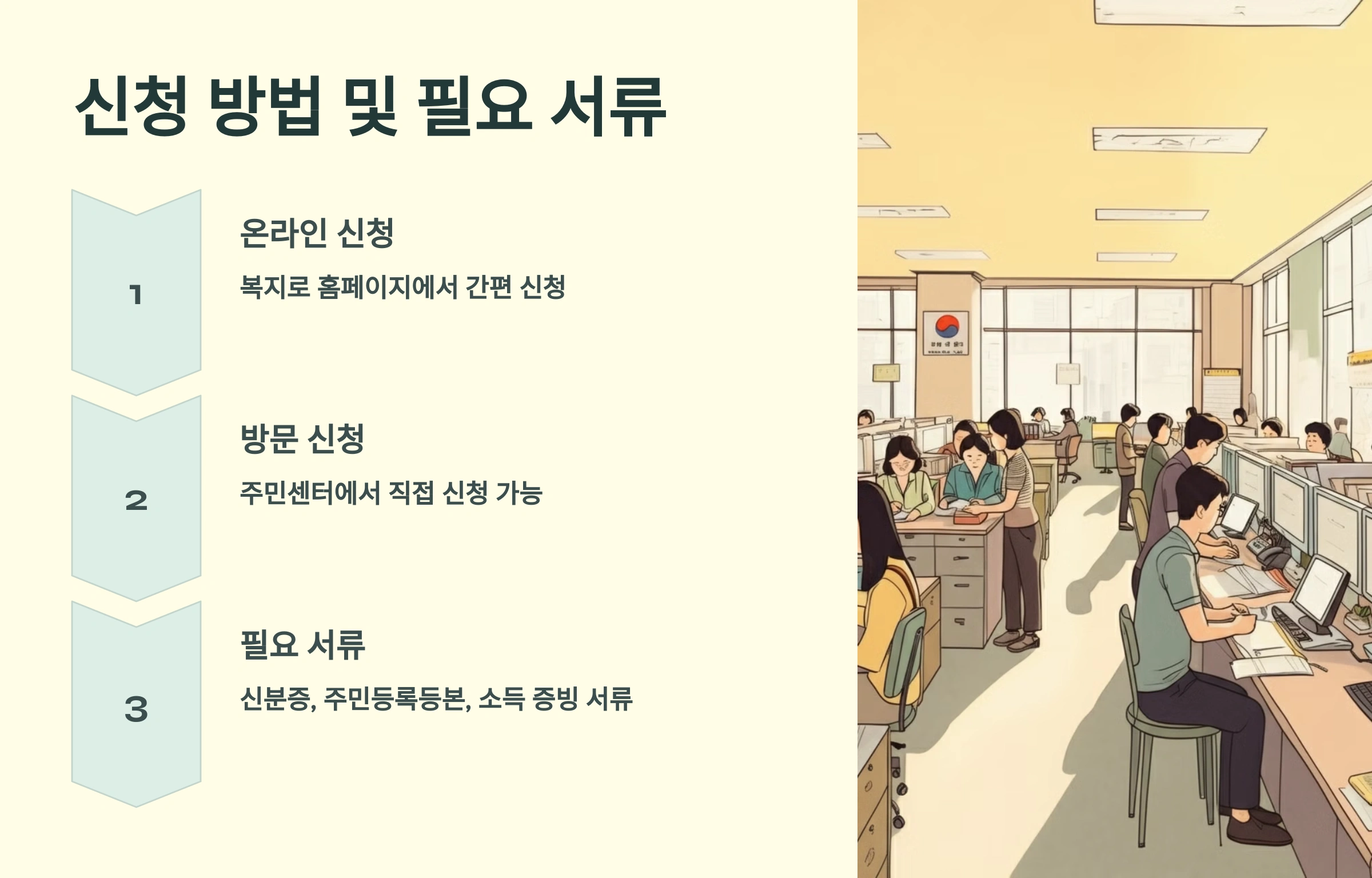 • 필수 서류: 주민등록등본, 신분증, 소득 증빙 서류