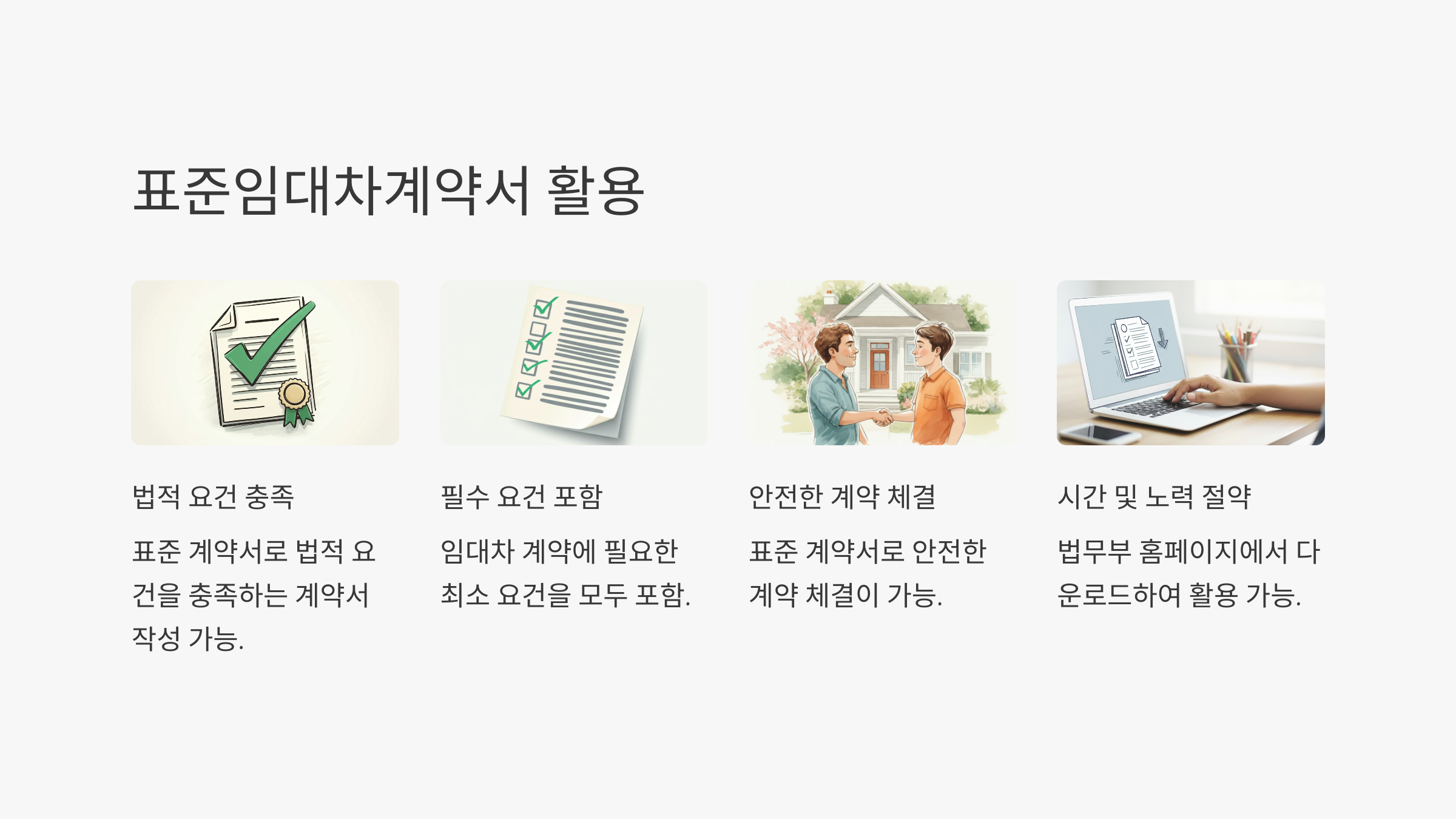 법무부는 주택임대차표준계약서를 제공하고 있습니다. 이를 활용하면 법적 요건을 충족하는 계약서를 작성할 수 있으며, 임대차 계약에 필요한 최소 요건을 모두 포함하고 있어 안전한 계약 체결이 가능합니다.