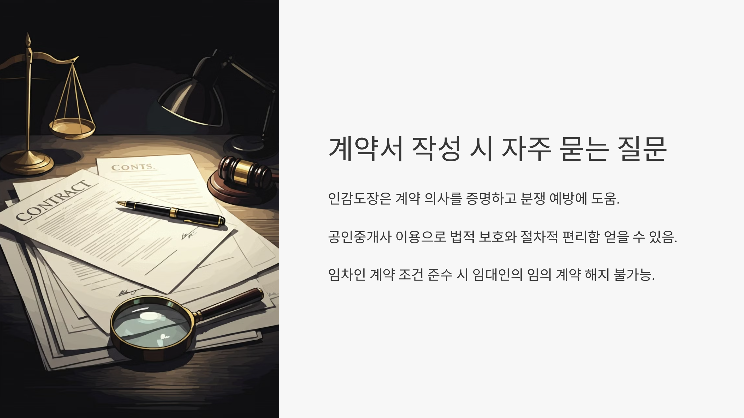 법적으로 인감도장이 필수는 아니지만, 계약의 신뢰성을 높이고 분쟁을 예방하기 위해 인감도장을 사용하는 것이 권장됩니다. 특히 계약서에 기재된 조건이 중요한 경우, 인감을 사용하면 나중에 발생할 수 있는 문제를 최소화할 수 있습니다.