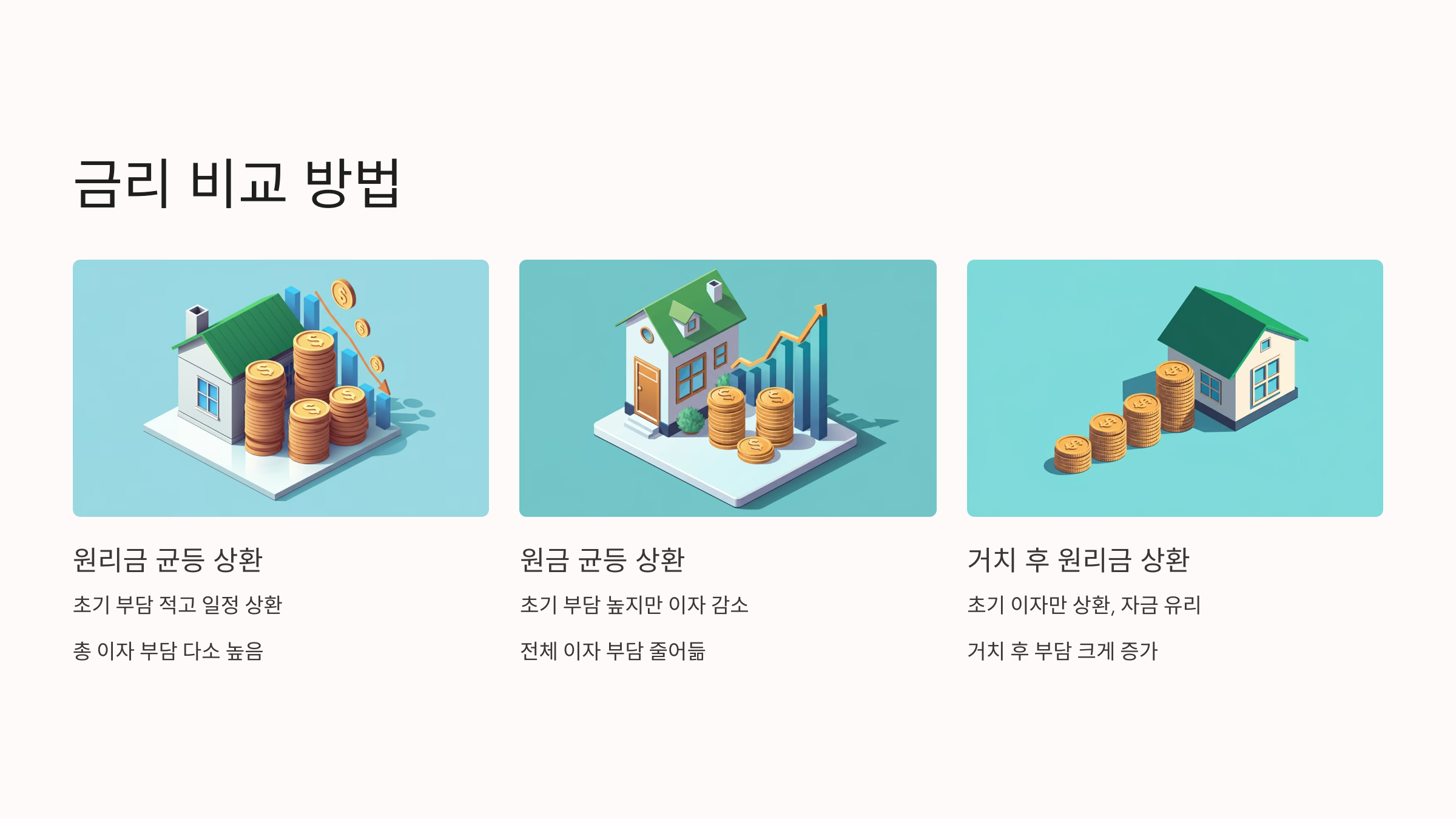 - 상환 방식에 따른 금리 차이 확인: 원리금 균등 상환, 원금 균등 상환 방식에 따라 금리가 다를 수 있으며, 이 점을 고려하여 비교해야 합니다.