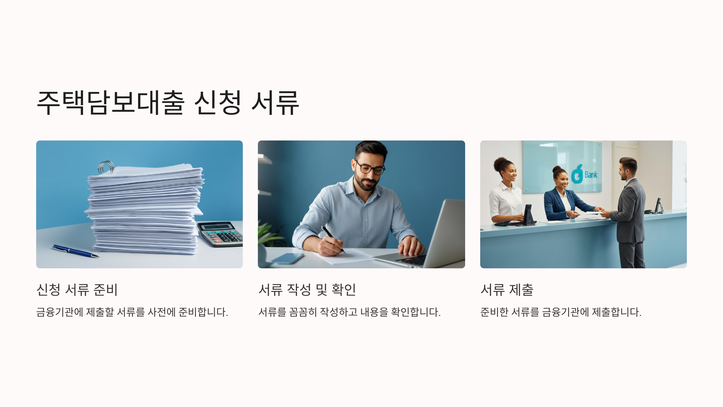 - 사전 심사 결과에 따라 금융기관에서 요구하는 서류를 준비하여 제출합니다. 소득 및 담보 확인 서류가 필요합니다.
