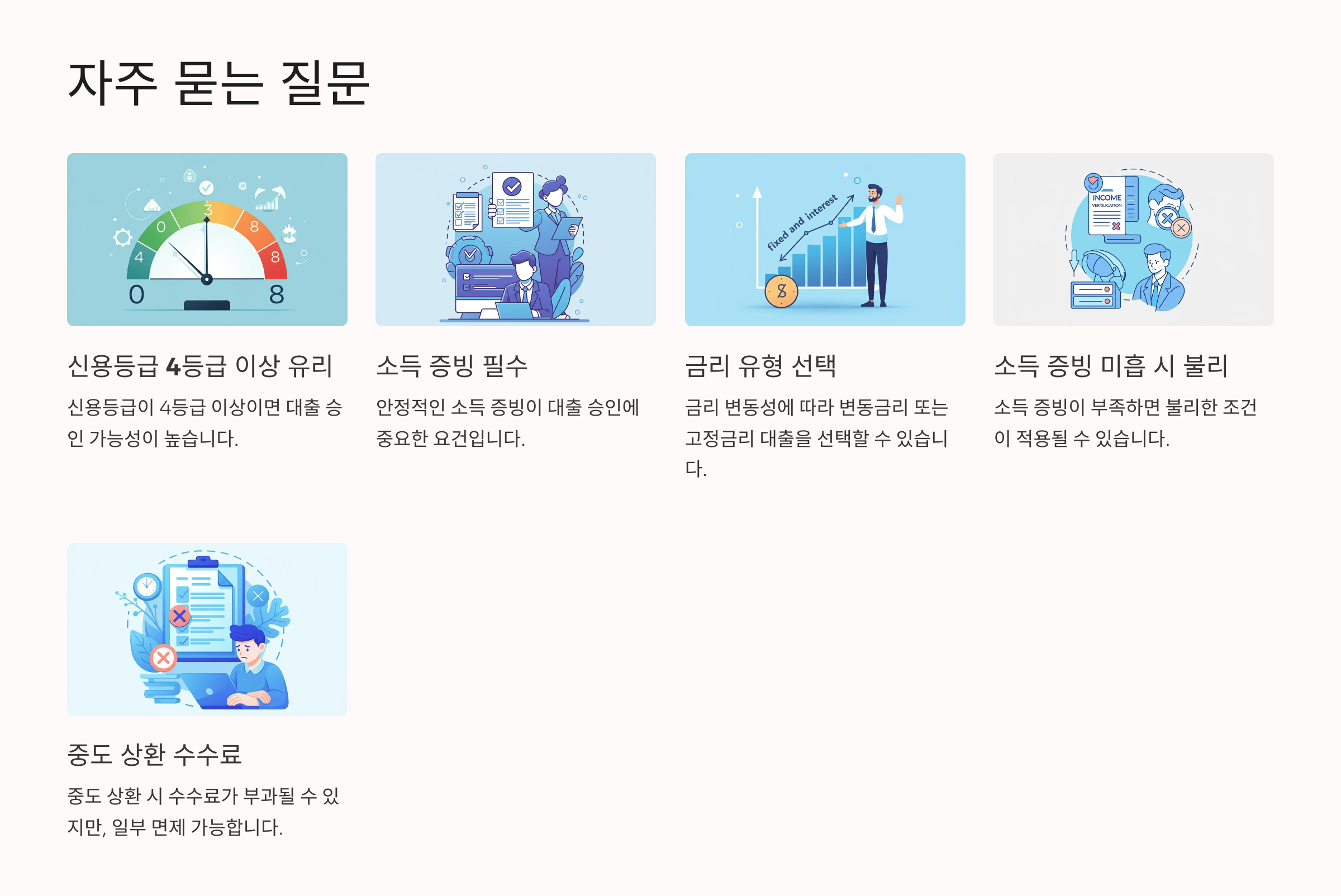 - 신용등급: 금융기관에서 요구하는 신용등급 기준을 충족해야 하며, 신용등급이 높을수록 대출 승인 가능성과 금리 혜택이 커질 수 있습니다.