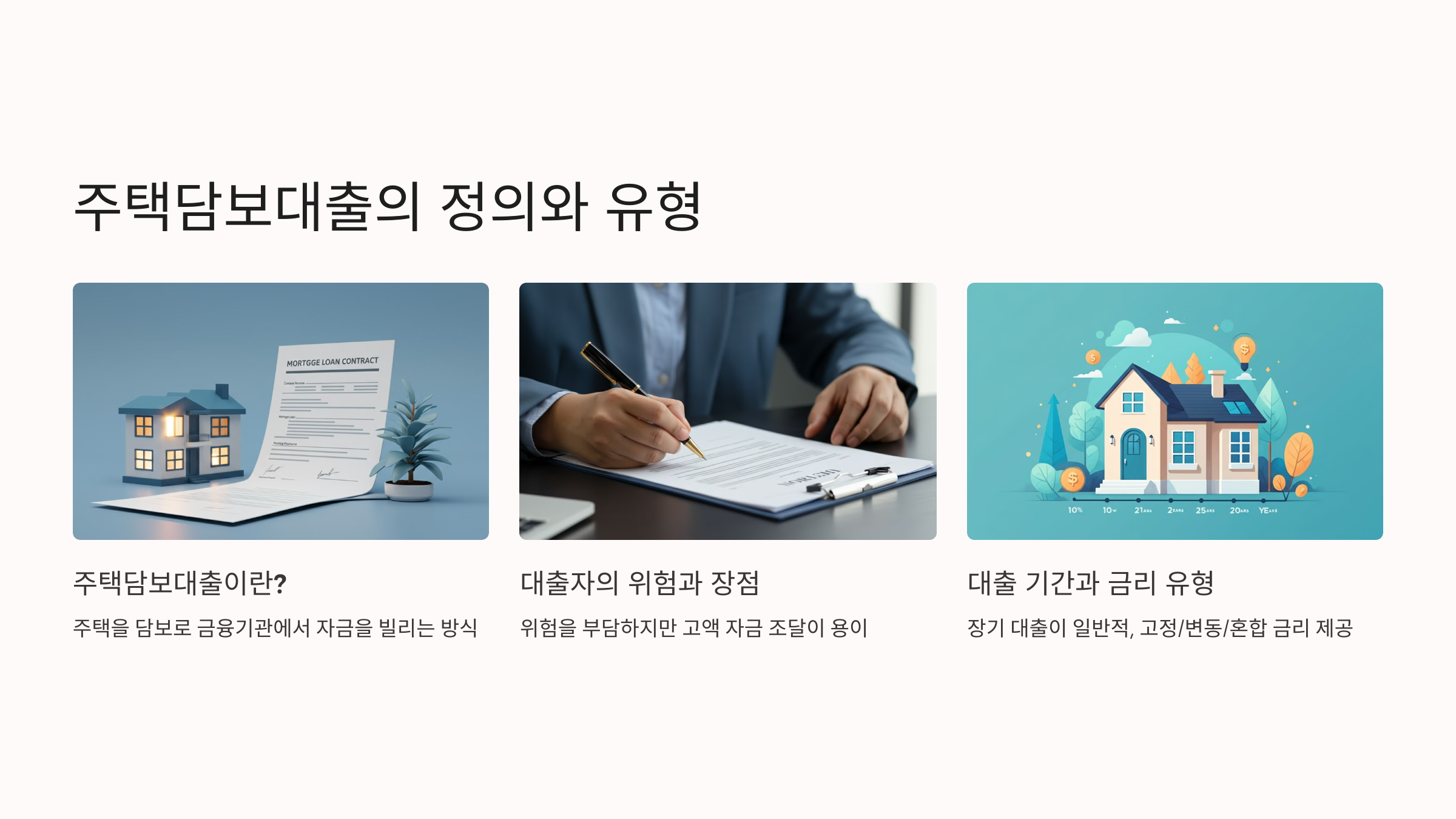 본 글에서는 주택담보대출의 기본 개념, 상품 유형, 금리 비교 방법, 신청 절차, 상환 전략 등 전반적인 내용을 상세히 다루어 본인의 상황에 맞는 최적의 대출을 선택할 수 있도록 돕겠습니다.
