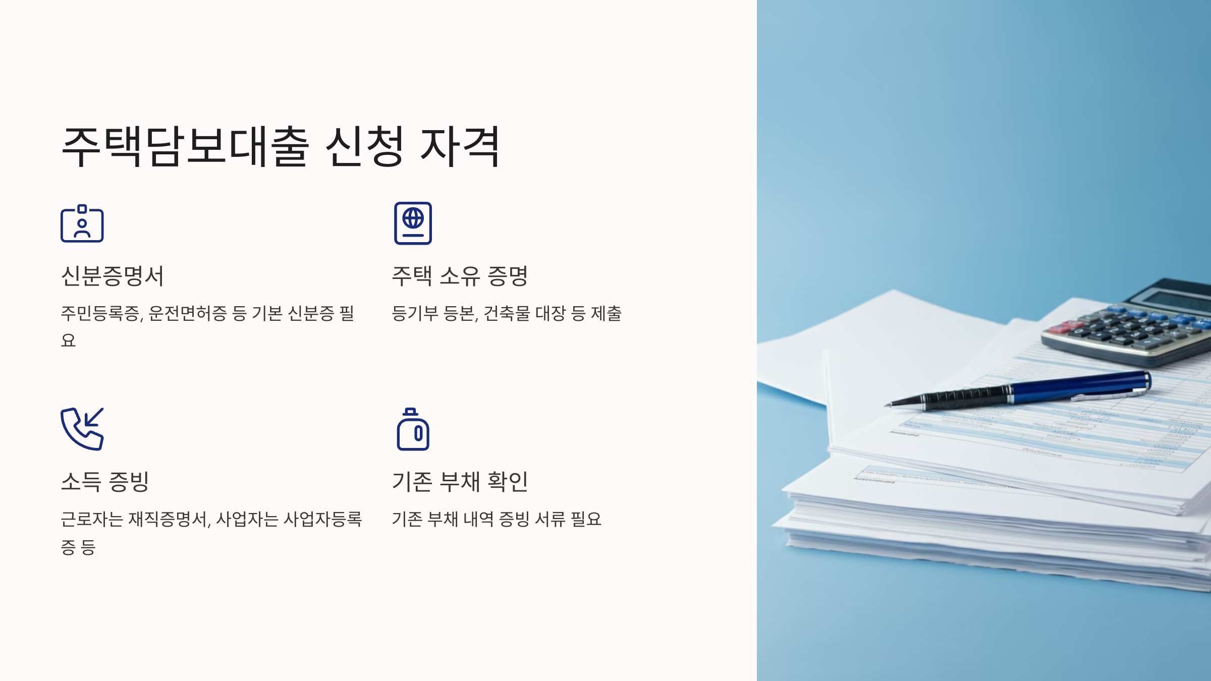 주택담보대출은 금융기관마다 자격 조건이 상이하지만, 기본적으로 담보 제공 가능 여부, 신용등급, 소득 증명, 기존 부채 상황 등을 고려하여 대출 여부가 결정됩니다. 일반적으로 다음과 같은 자격 조건을 갖추어야 합니다.