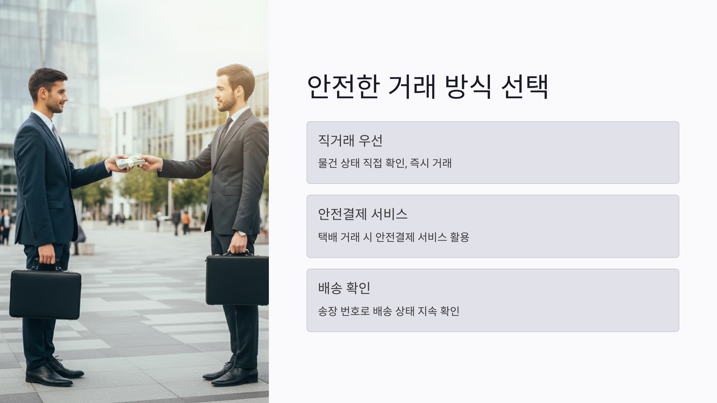 가능한 경우 직거래 우선: 물건 상태를 직접 확인하고 바로 돈을 주고받을 수 있어 안전합니다.