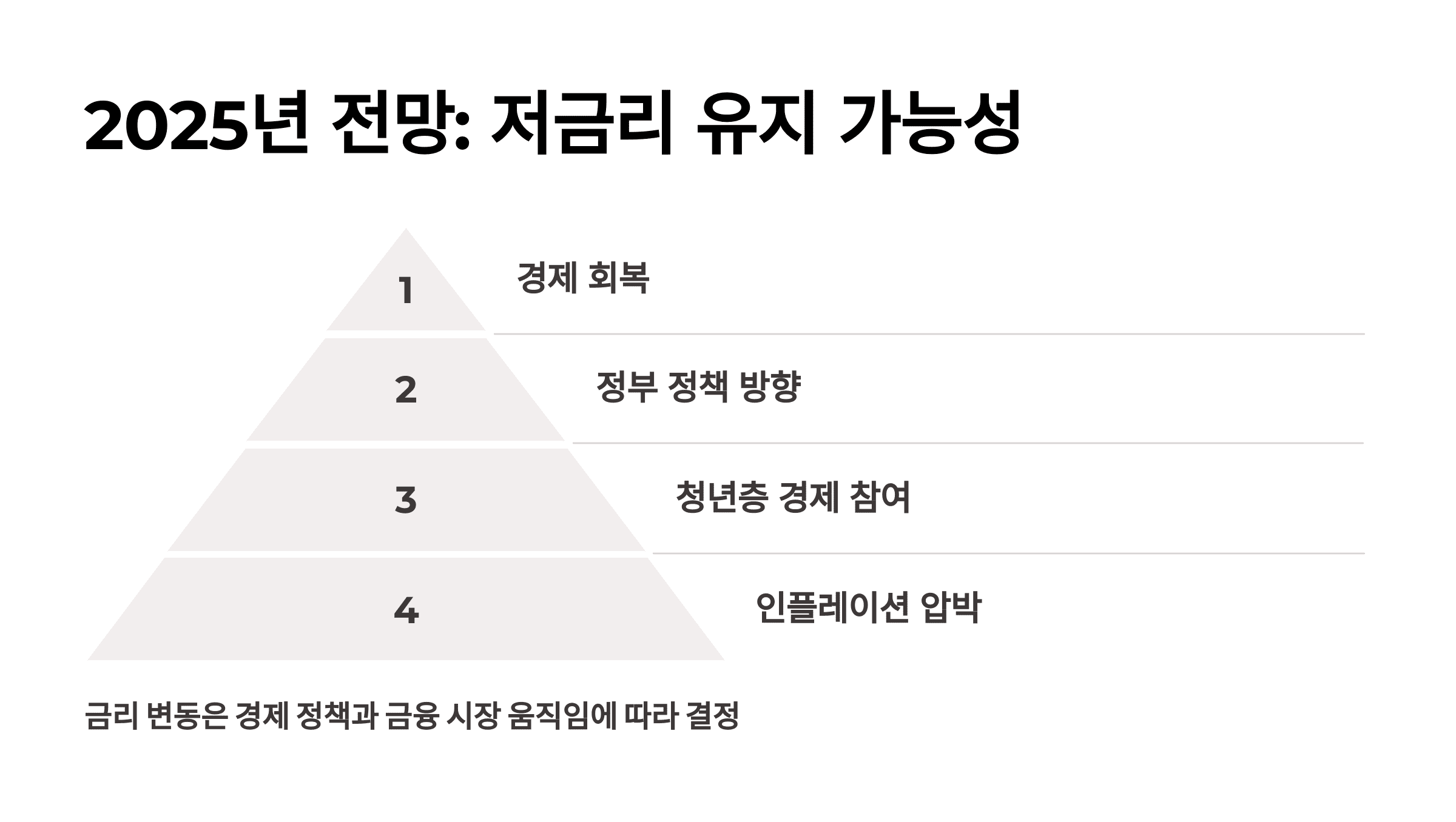 2025년에도 2.2% 금리가 유지될지는 많은 변수가 관여하고 있습니다. 경제 회복 여부와 정부 정책 방향이 핵심입니다. 경제가 안정적으로 회복되고, 정부가 저금리 정책을 지속적으로 추진한다면 저금리 유지 가능성이 높아집니다.