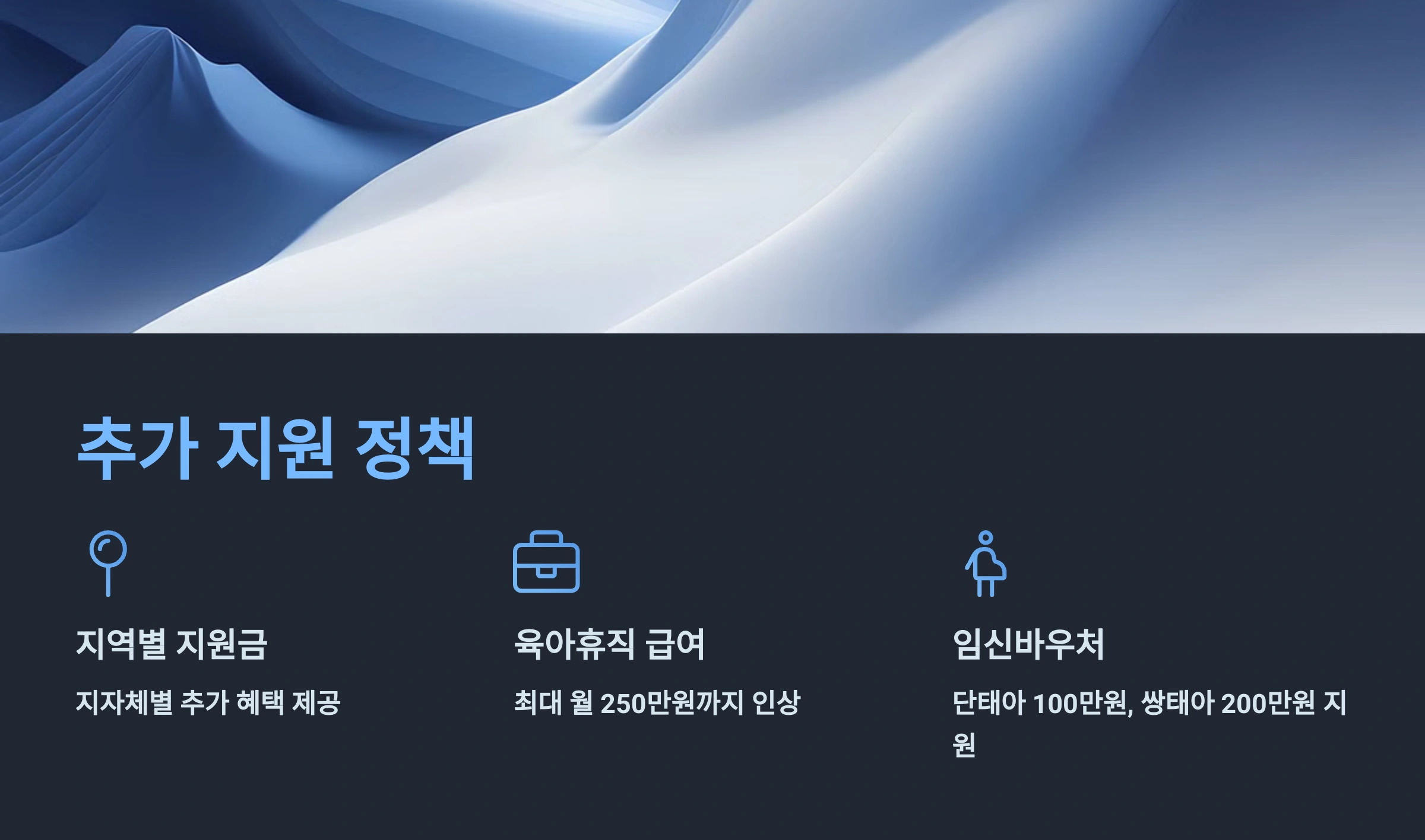 지역별로 추가 출산 지원금이 제공됩니다. 예를 들어, 서울시는 첫째 아이에게 월 10만 원씩 2년간, 둘째 아이에게는 월 20만 원씩 2년간 지원합니다. 다른 지역의 지원금은 해당 지자체 홈페이지에서 확인할 수 있습니다.