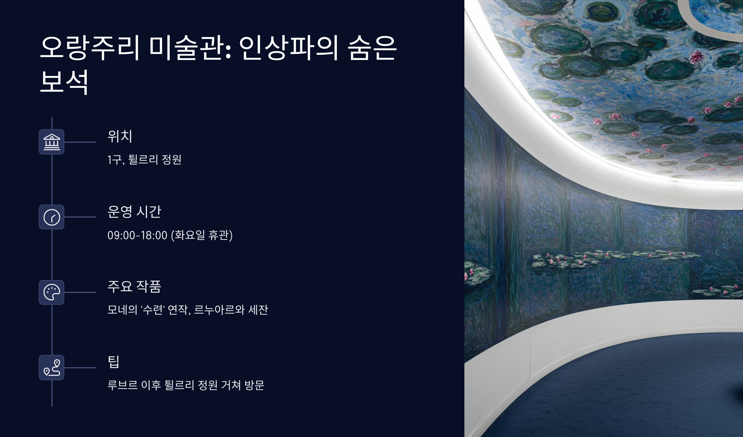 루브르 박물관과 가까워서 함께 둘러보기에 좋은 코스예요. 인상파 작품을 좋아한다면 절대 놓치지 말아야 할 명소랍니다.