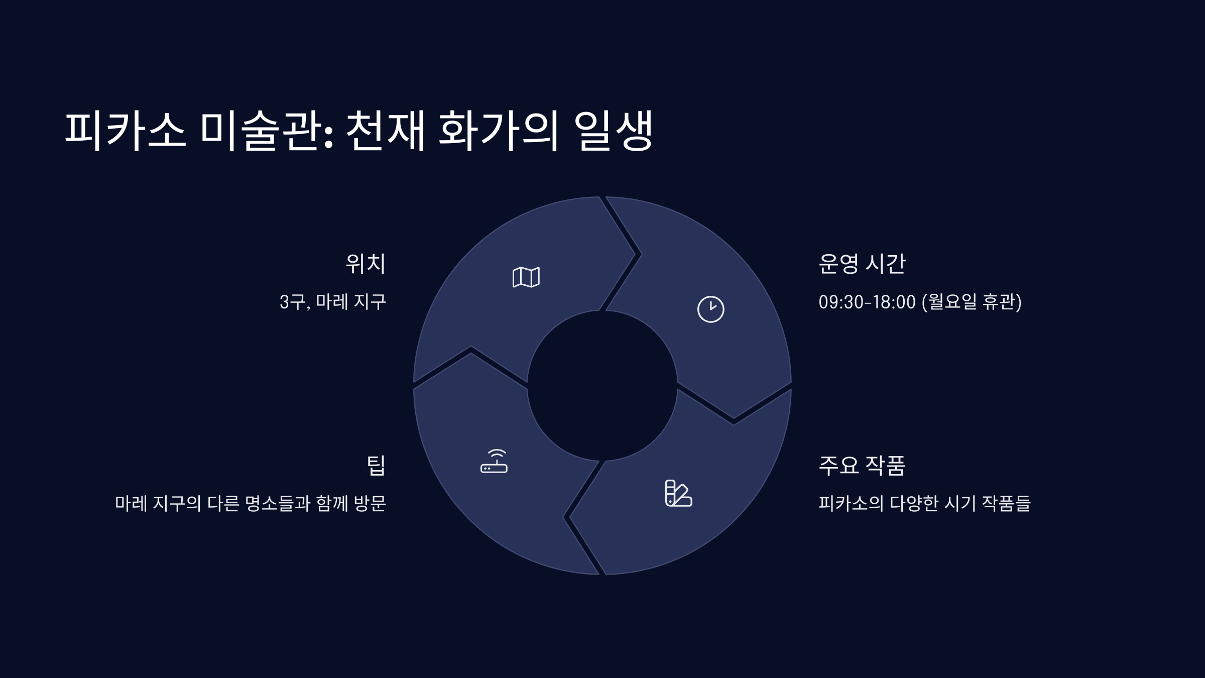 피카소 미술관은 피카소의 방대한 작품을 소장하고 있는 미술관으로, 그의 초기 시절부터 말년까지의 다양한 작품들을 감상할 수 있어요. 회화, 조각, 드로잉 등 다양한 분야의 작품들이 전시되어 있습니다.