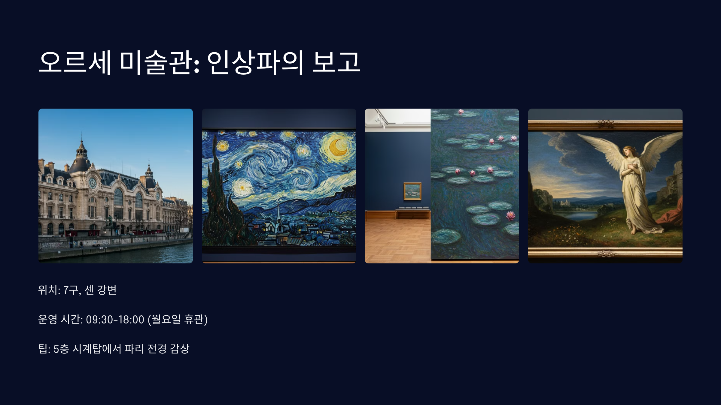 오르세 미술관은 인상파와 후기 인상파 작품들을 중심으로 전시하는 곳으로, 원래 기차역으로 사용되었던 건물을 개조하여 만든 미술관이에요. 이곳에서는 모네, 르누아르, 반 고흐의 명작들을 감상할 수 있어요.