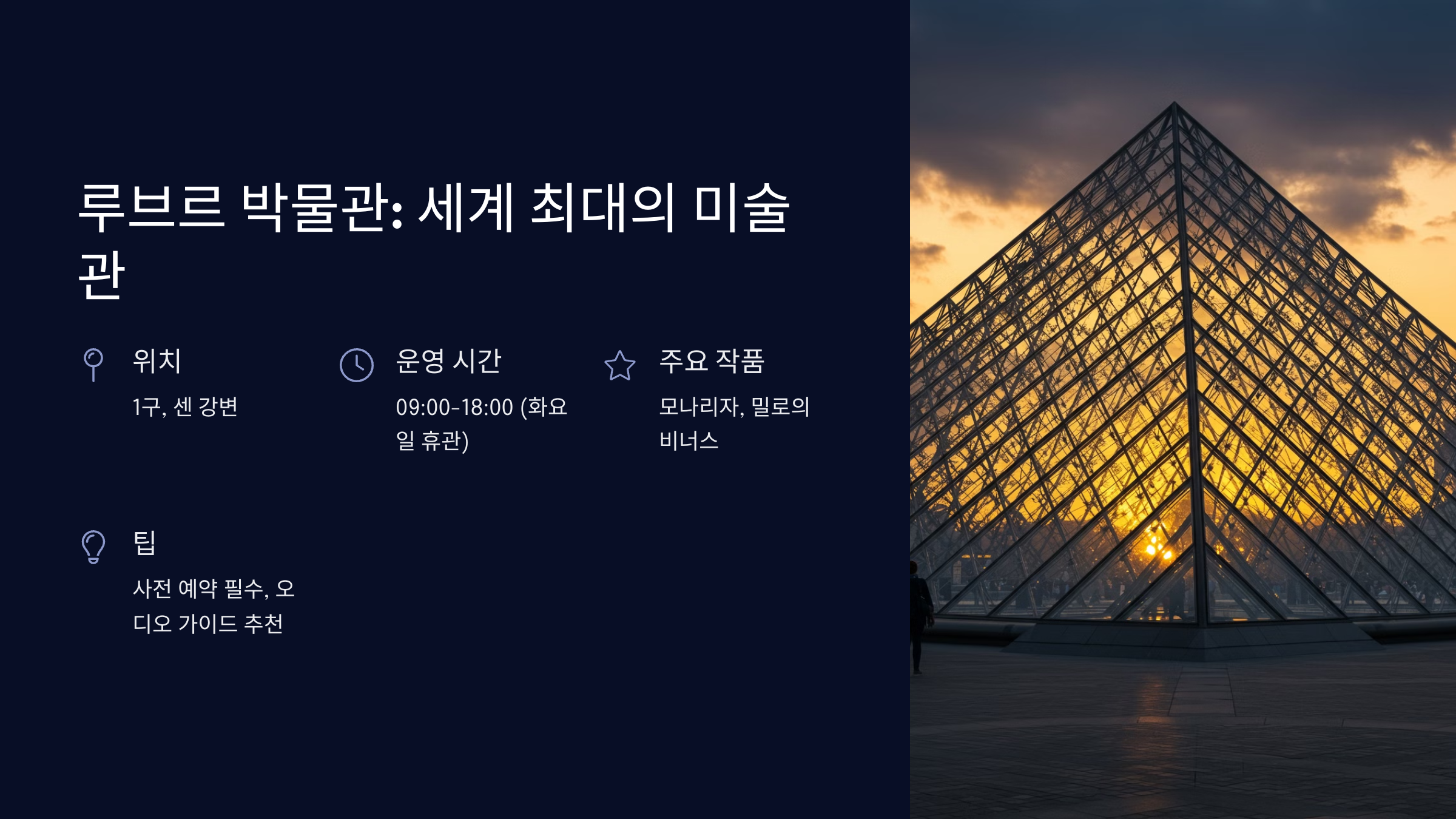 루브르 박물관은 세계 최대의 미술관이자 파리의 랜드마크 중 하나로, 수많은 명작들을 소장하고 있어요. 이곳은 원래 왕궁이었지만, 현재는 미술 작품을 전시하는 공간으로 활용되고 있답니다.