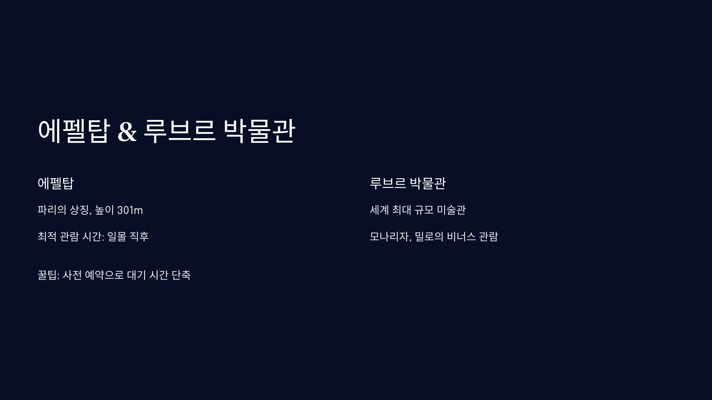 에펠탑은 파리 여행의 상징이죠. 멀리서 바라봐도 멋지지만, 가까이서 보면 그 웅장함이 더욱 인상적이에요. 낮과 밤, 모두 다른 매력을 보여주는 곳이기도 해요. 특히 저녁 시간대의 조명쇼는 꼭 봐야 해요!😆