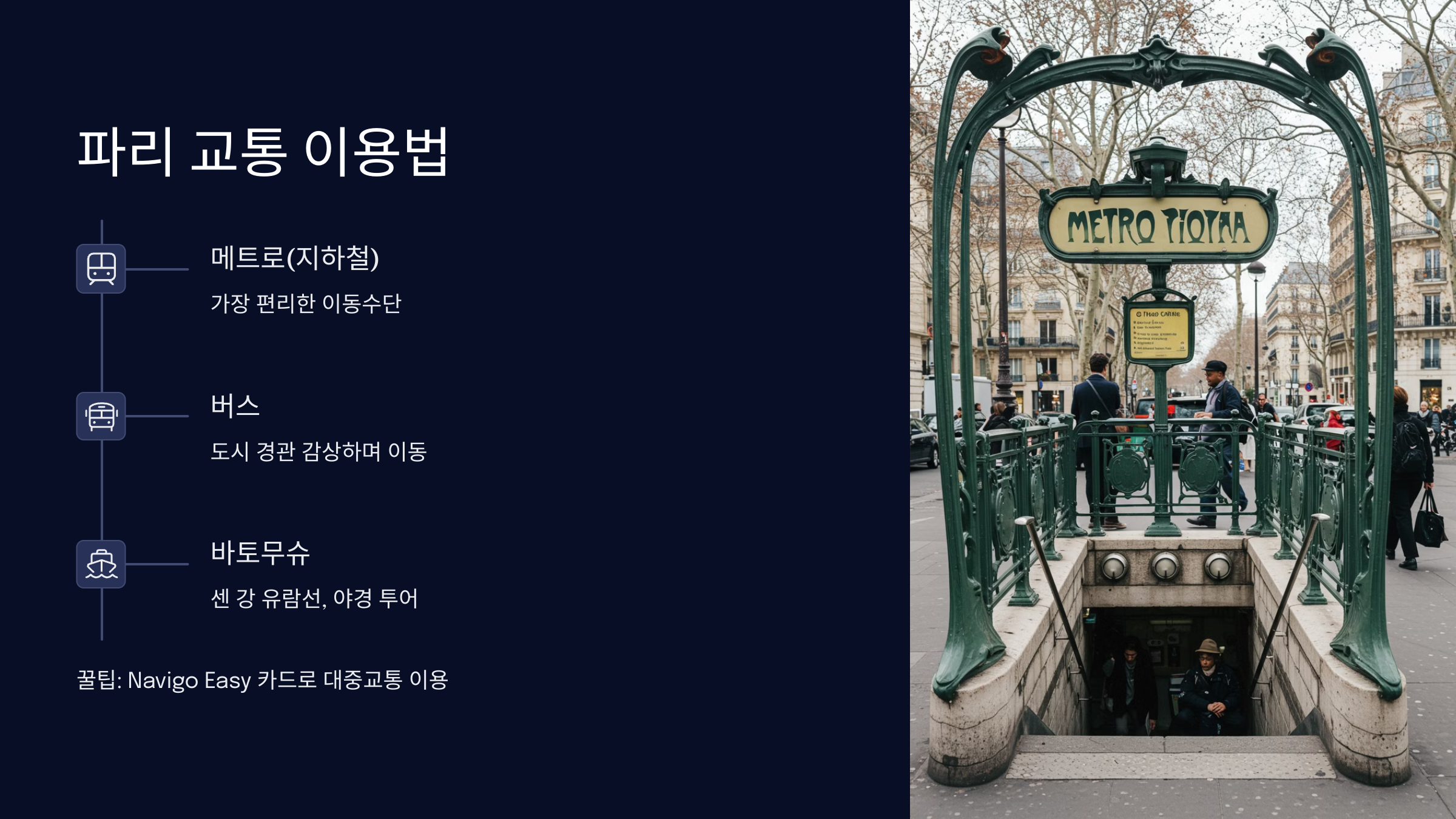 여행 팁: Navigo Pass를 이용하면 교통비를 절약할 수 있어요. 일주일권, 하루권 등 다양한 옵션이 있으니 일정에 맞게 선택하세요.💸