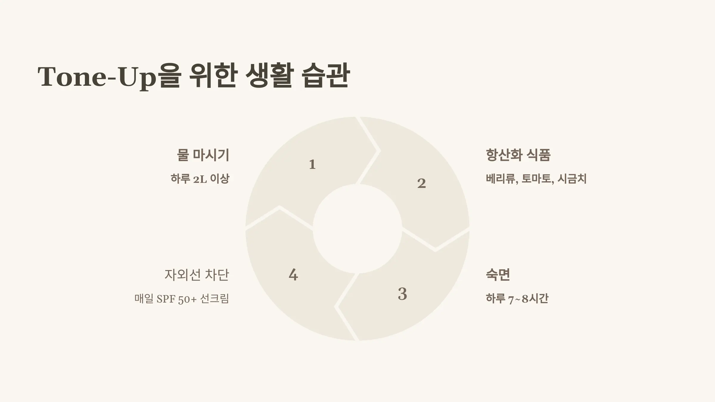 피부 재생을 돕는 생활 습관을 실천하면 자연스럽게 톤업 효과를 볼 수 있어요.