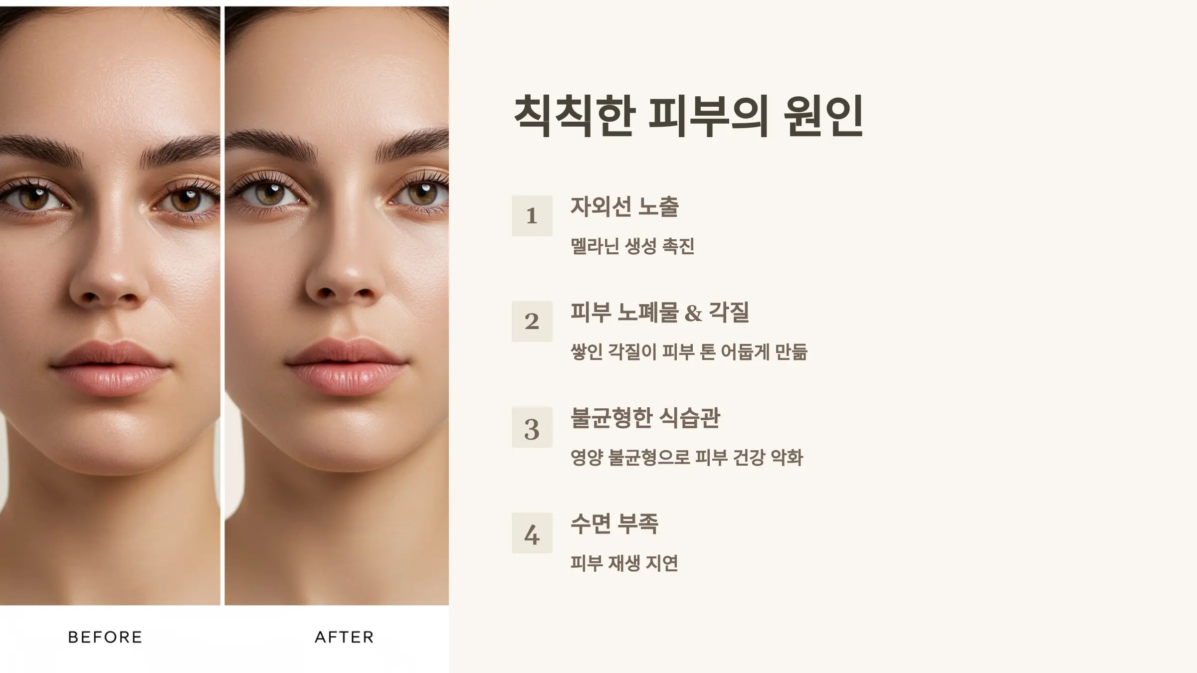 | 🍔 불균형한 식습관 | 영양 불균형은 피부 건강을 악화시키고 톤을 어둡게 만들어요. |