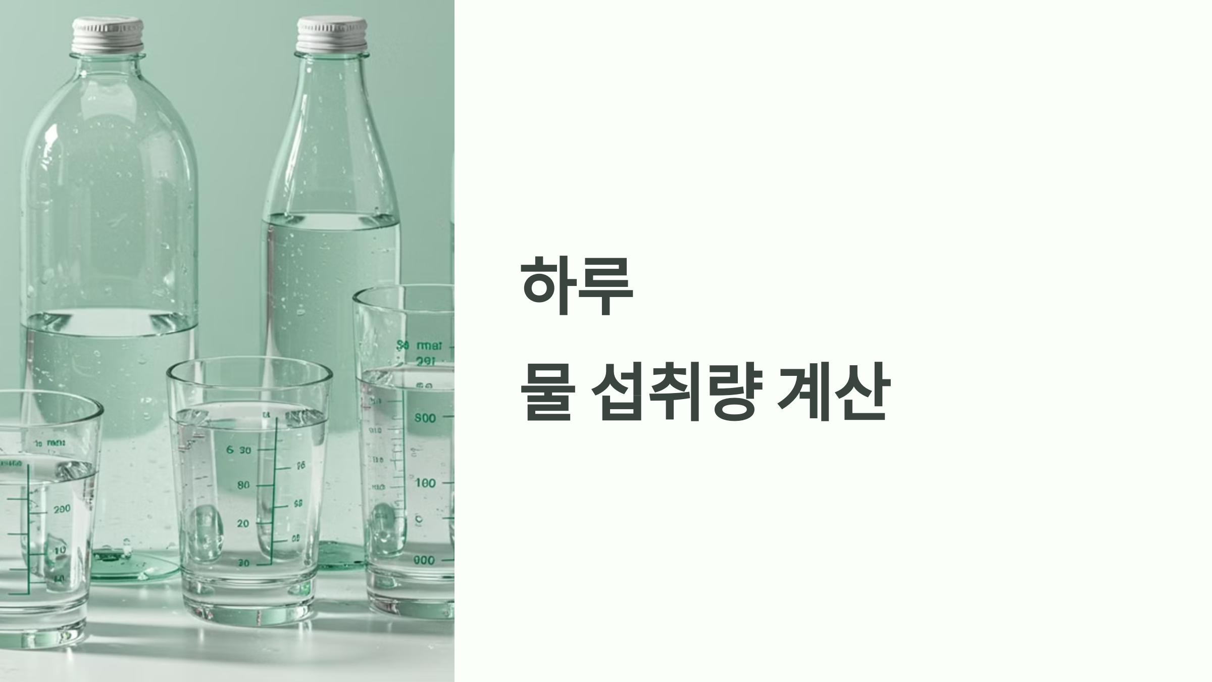 하루 물 섭취량 계산 방법과 건강한 몸을 위한 적정량을 소개해요. 체중별, 연령별 맞춤 물 섭취 가이드를 확인하세요!