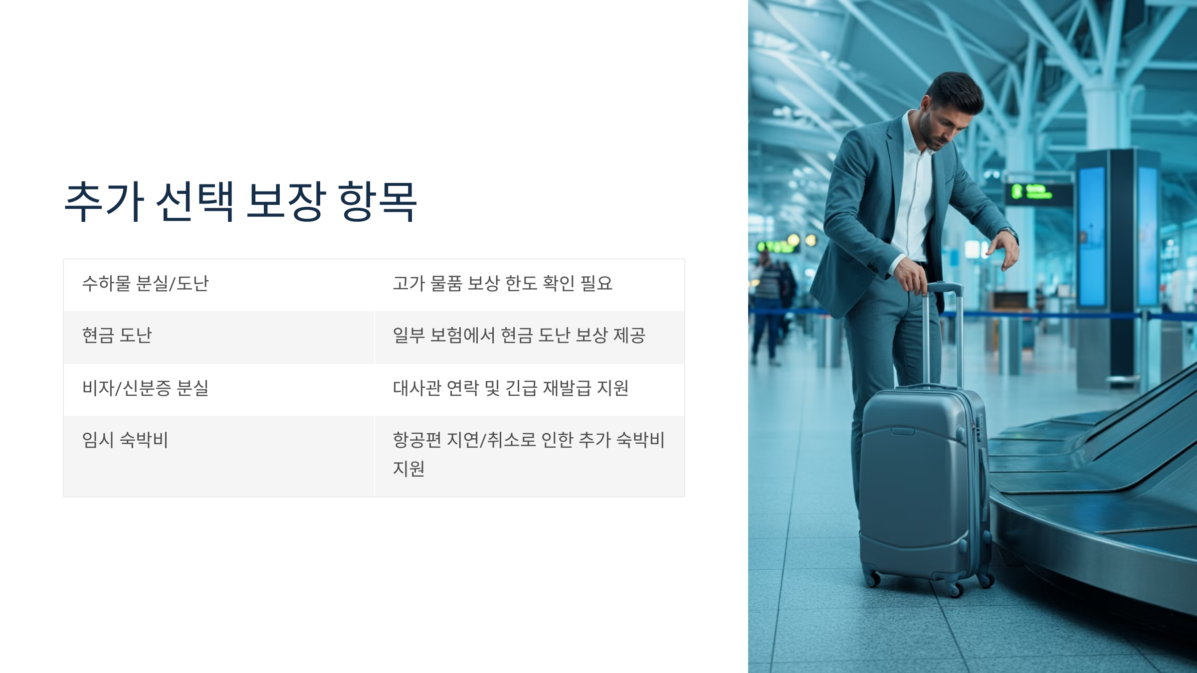 항공편 지연이나 취소로 인해 발생하는 추가적인 숙박비를 지원하는 보험 항목도 있습니다.