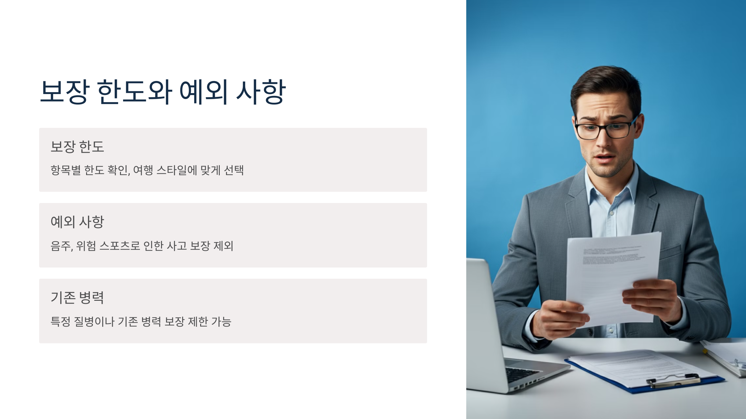 의료비나 긴급 후송 비용, 물품 도난 보상 등 각 항목별로 한도가 있으므로, 자신의 여행 스타일에 맞는 보장 금액을 선택하는 것이 좋습니다. 예를 들어, 의료비 보장이 높은 상품은 의료비가 비싼 국가 방문 시 유리할 수 있습니다.