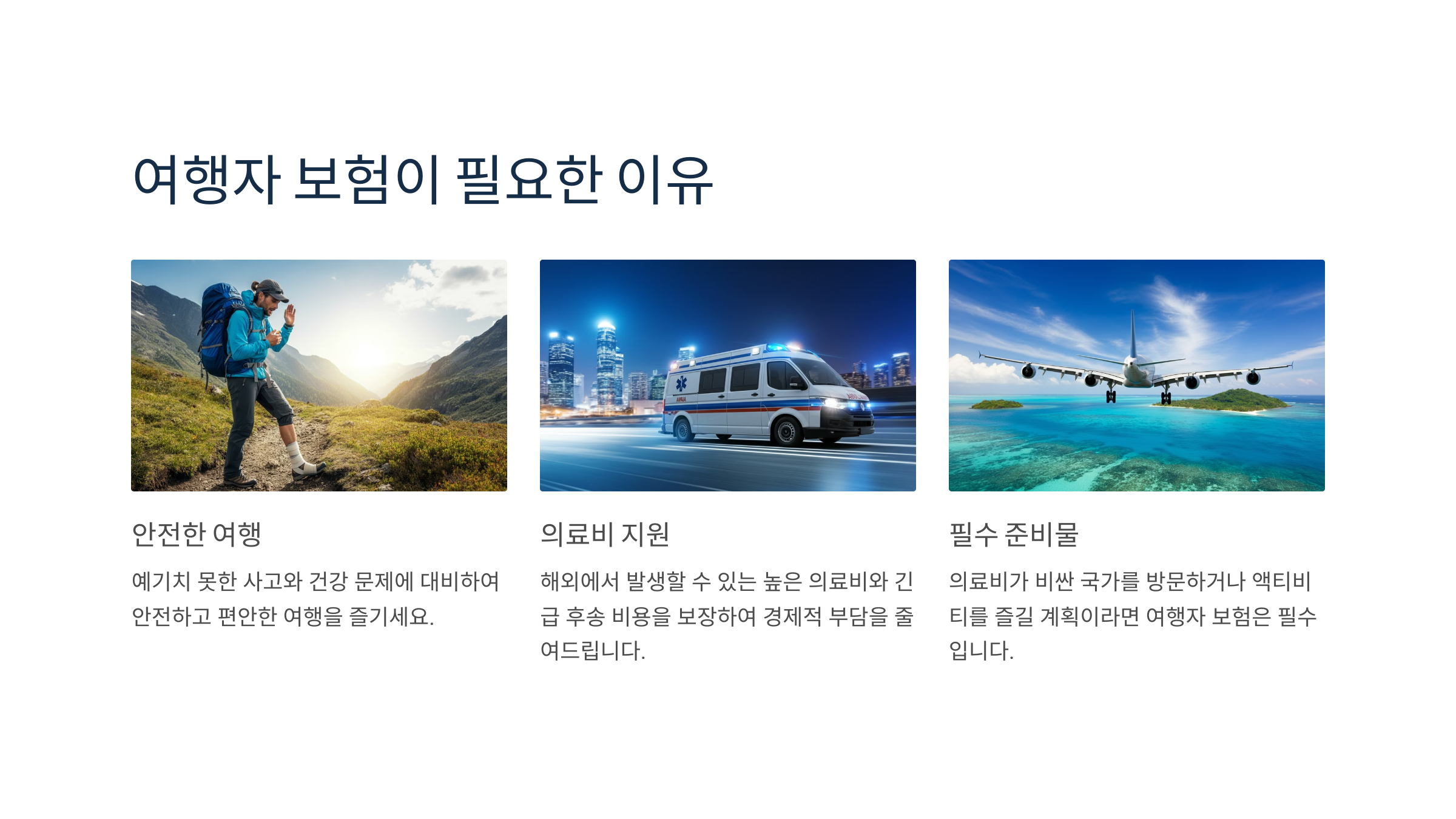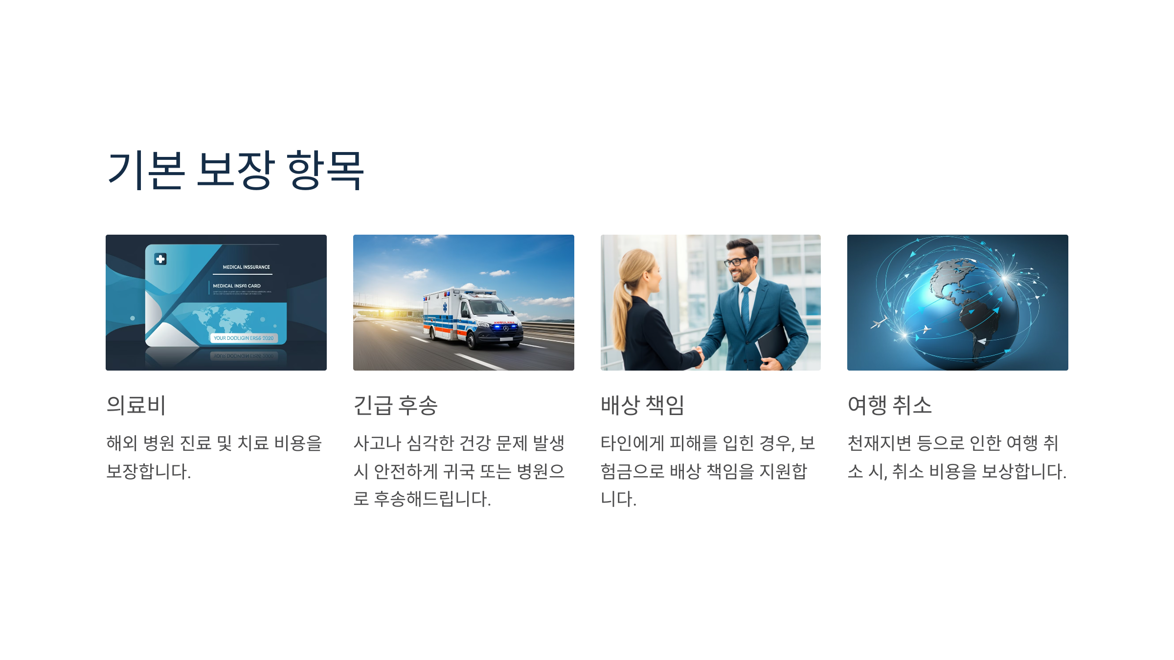 - 리뷰: "해외에서 병원 치료를 받을 때 보험이 큰 도움이 되었어요. 긴급 상황에서도 빠르게 대응해 주어서 믿을 수 있었습니다."