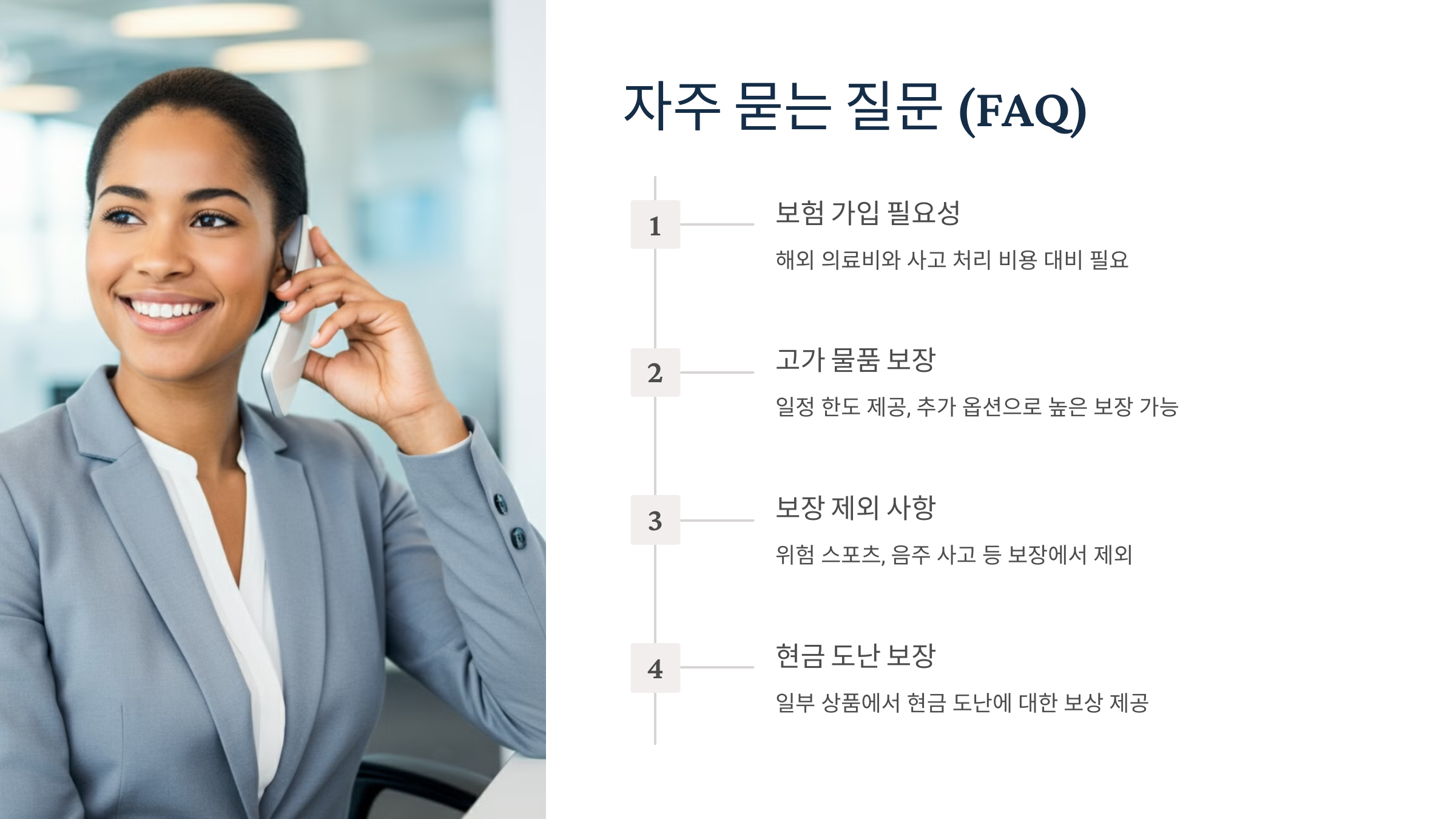 여행자 보험이 모든 상황을 보장해 주지는 않습니다. 음주로 인한 사고, 위험 스포츠 (예: 스카이다이빙, 번지점프)로 인한 사고는 대부분 보장되지 않습니다.