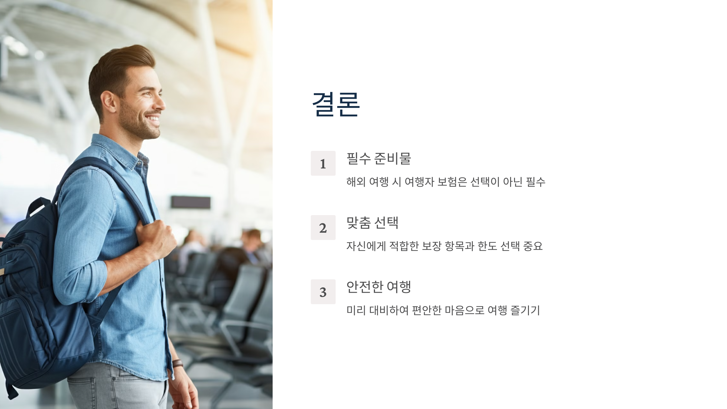 다양한 보험 상품이 있지만, 자신에게 적합한 보장 항목과 한도를 선택하는 것이 중요합니다. 미리 대비하여 안전한 여행을 즐기세요! 😊