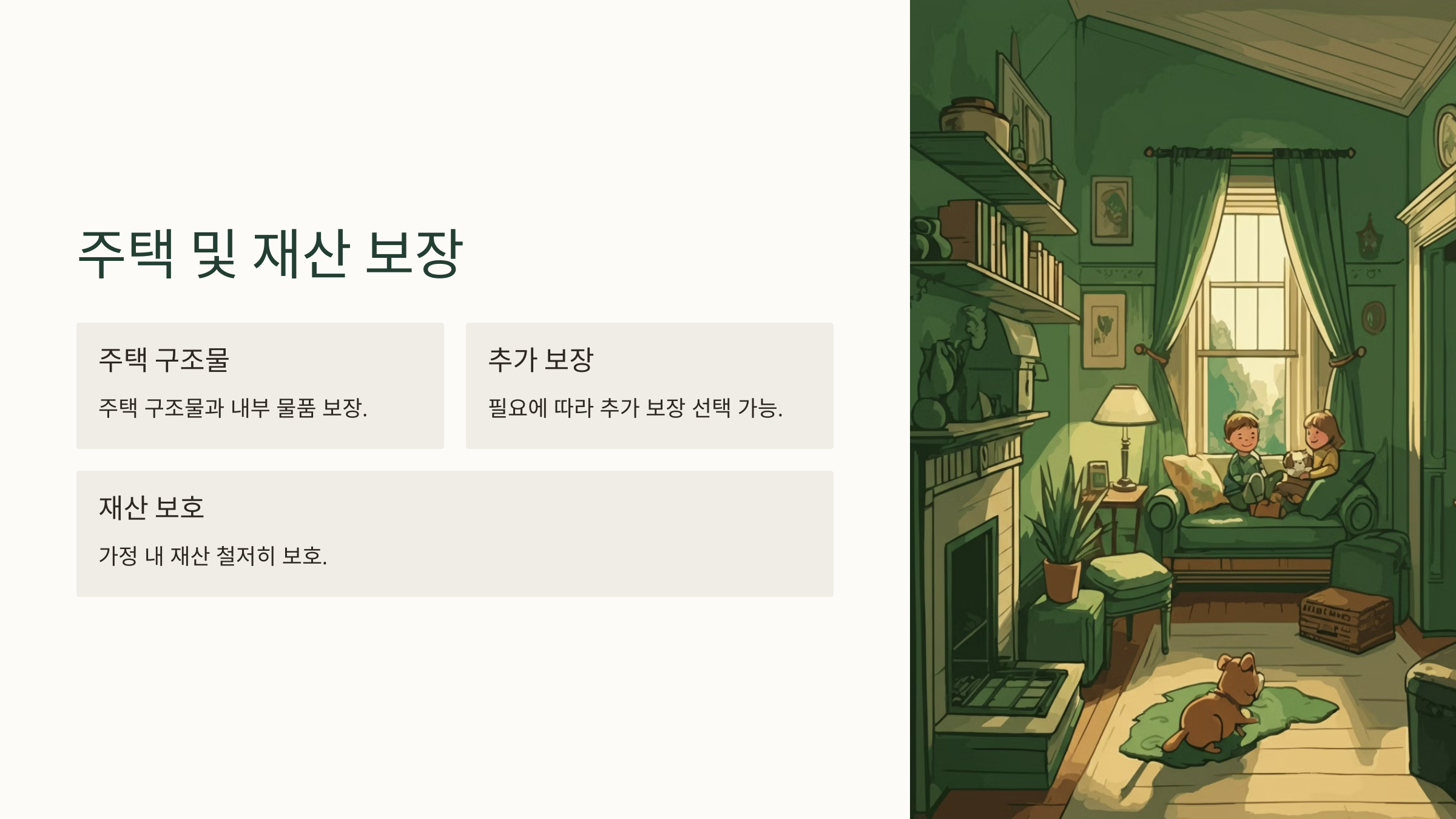 화재보험은 주택 구조물은 물론, 주택 내 가구, 개인 소유물까지 보장하여 전반적인 재산 보호를 제공합니다.