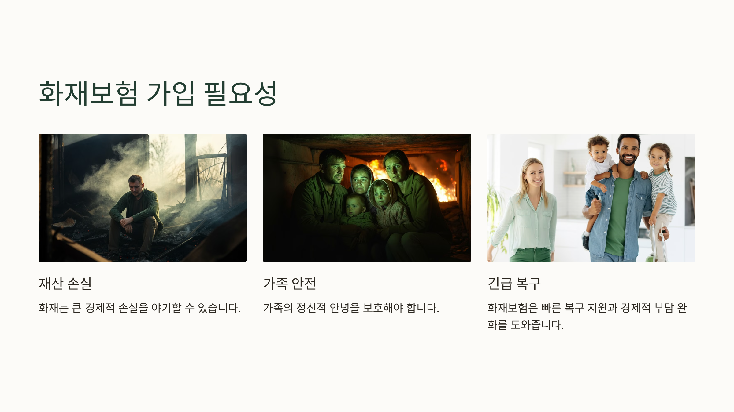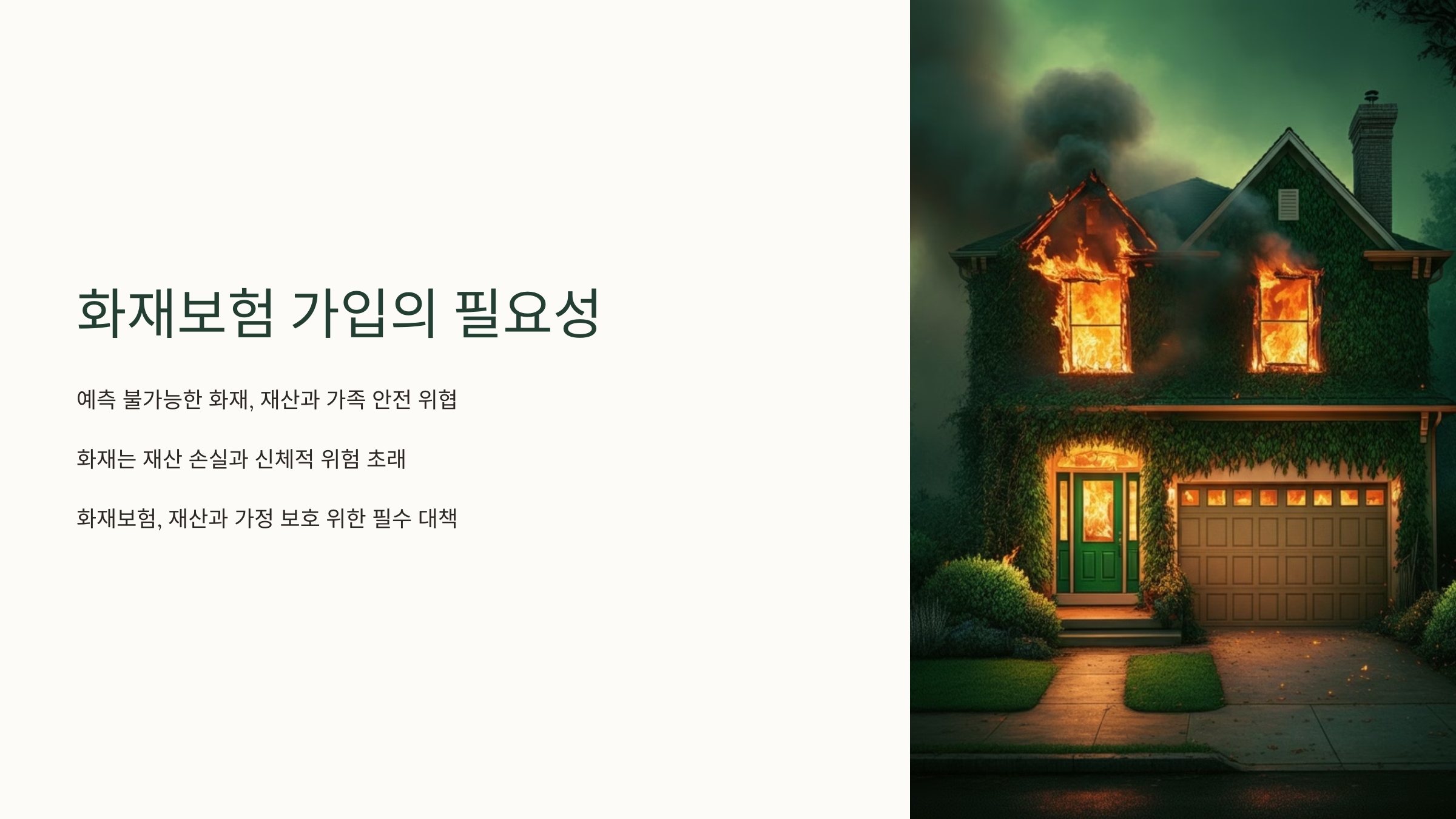 화재는 순간적으로 큰 경제적 손실을 야기하며, 가정과 재정적 안정성을 한순간에 무너뜨릴 수 있는 사고입니다.