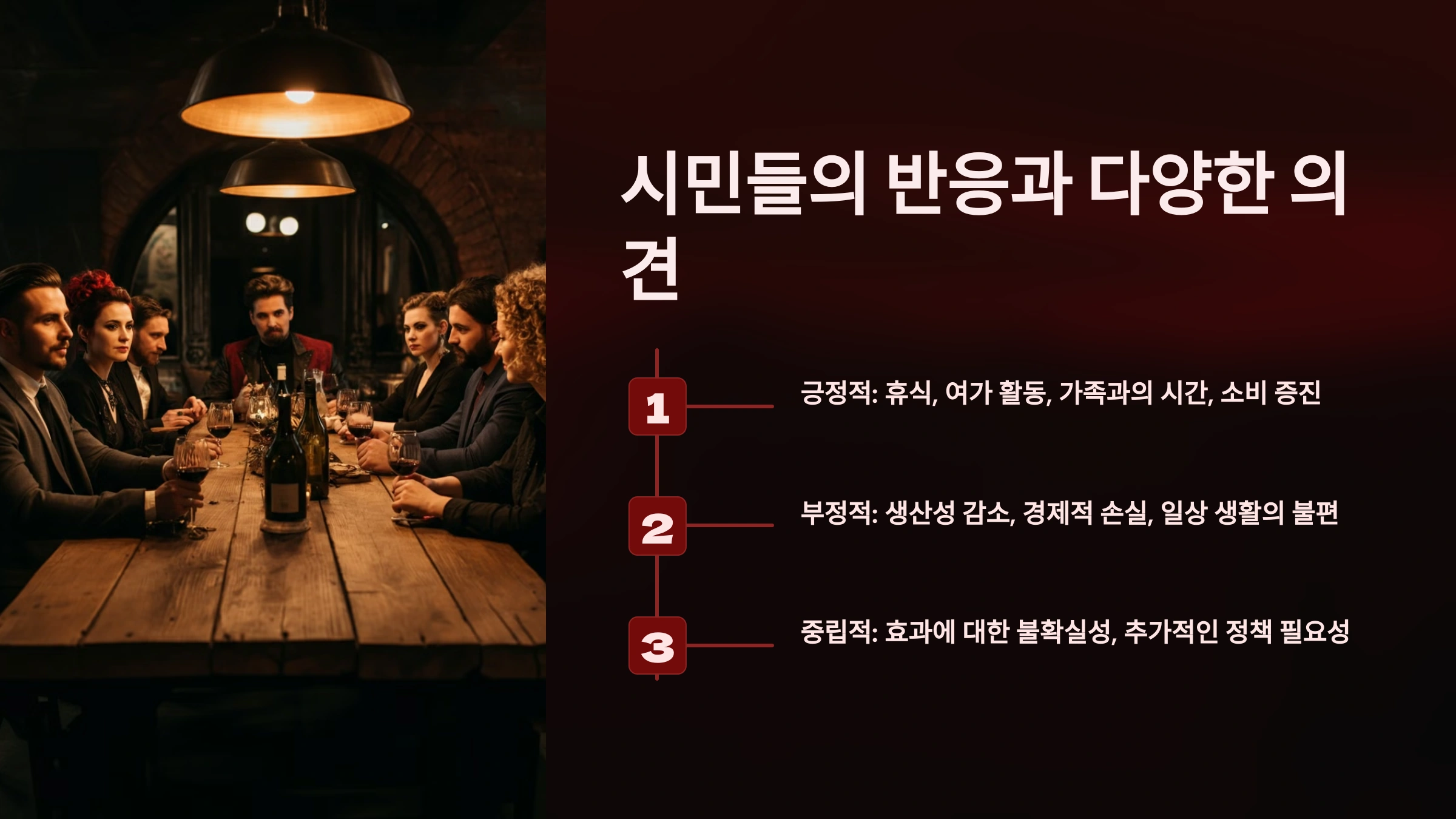 다양한 관점에서 논의가 이어지고 있지만, 일단 하루 쉰다는 사실 자체만으로도 행복감을 느끼는 사람들이 많다는 점이 눈길을 끌어요. 😊