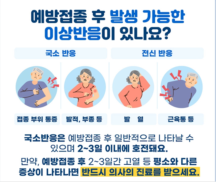 - 접종 후에는 과도한 운동이나 음주를 피하시고, 충분한 수분 섭취와 휴식을 취하시기 바랍니다.