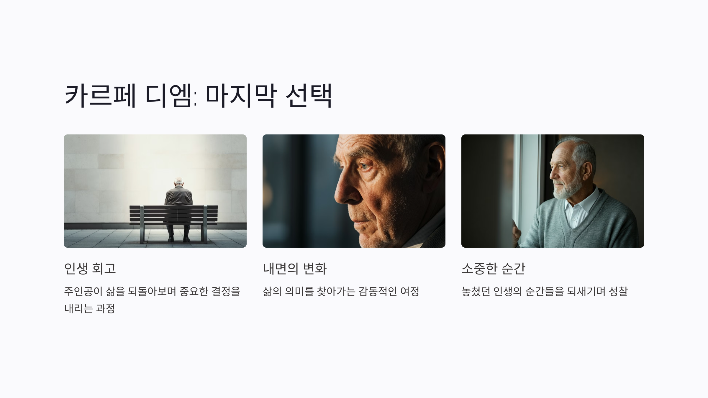 ‘카르페 디엠: 마지막 선택’은 인생의 마지막 순간을 맞이한 주인공이 자신의 삶을 되돌아보며 중요한 결정을 내리는 이야기를 다룬 드라마입니다. 인생의 순간들을 회상하며 삶의 의미를 찾아가는 여정이 감동적으로 그려진 영화입니다.