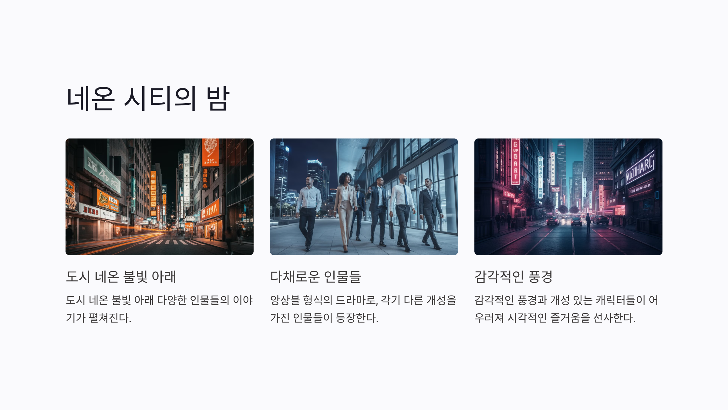 매력적인 캐릭터들이 서로 얽히며 만들어내는 다채로운 이야기가 전개되며, 화려한 도시의 야경이 주는 분위기가 돋보입니다. 앙상블 드라마의 다채로운 매력을 느끼고 싶은 관객에게 추천할 만한 작품입니다.