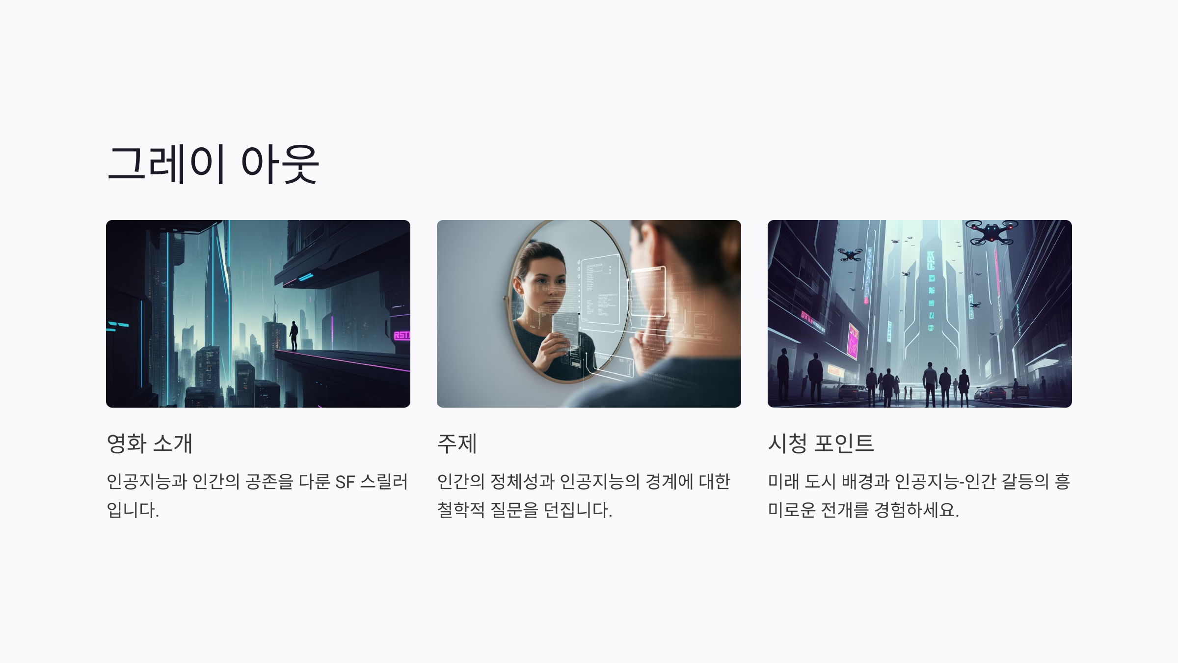 인공지능과 인간의 공존을 주제로 한 SF 스릴러 ‘그레이 아웃’은 미래 도시에 사는 한 과학자가 인공지능에게 자아를 심으려는 실험에서 벌어지는 이야기를 다룹니다.